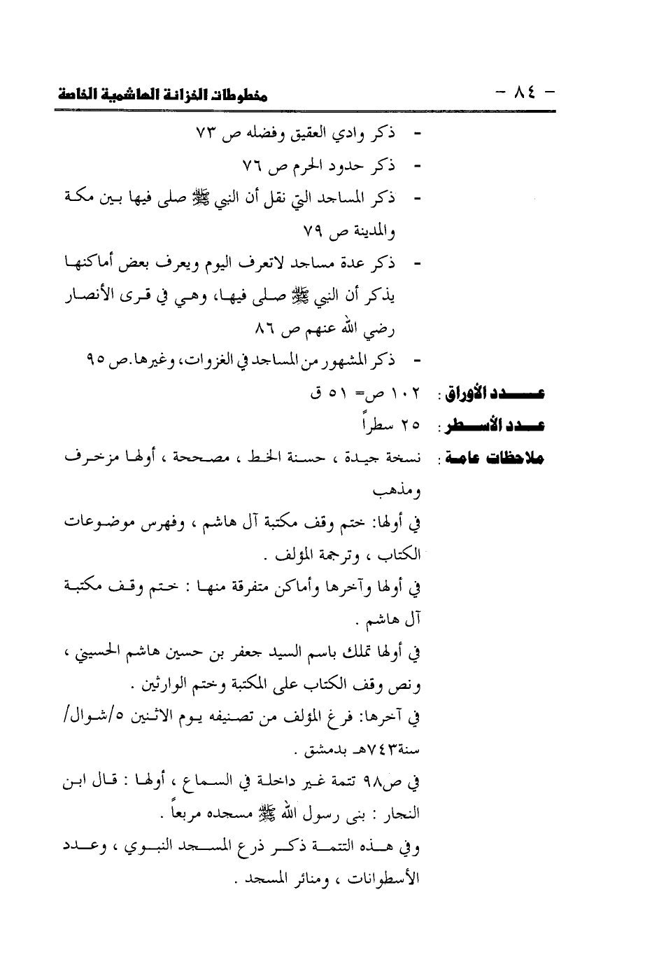في أولها: ختم وقف مكتبة آل هاشم، وفهرس موضوعات