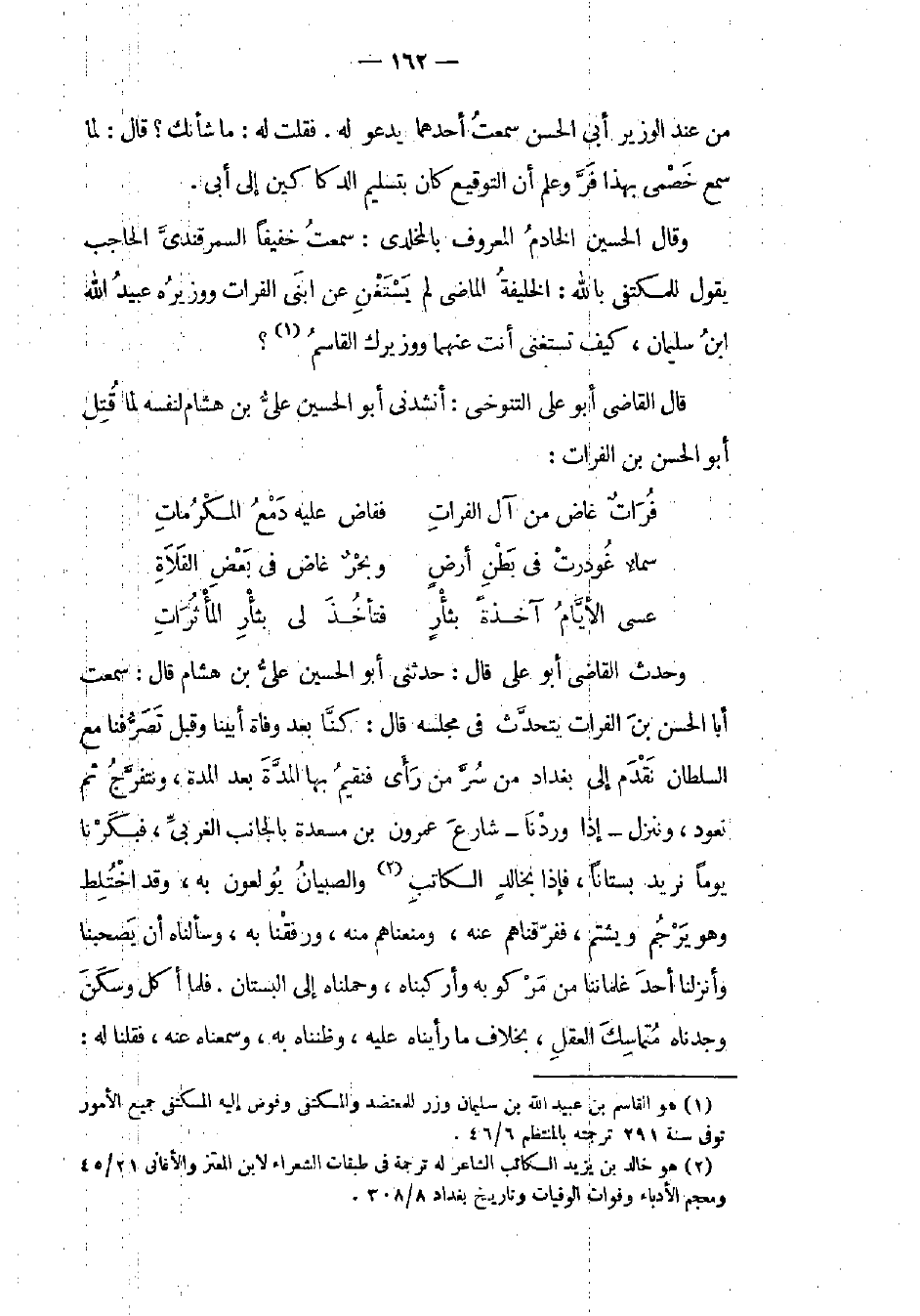 وقال الحسين الخادم المعروف بالمخلدي: سمعت خفيفاً لسمرقندي الحاجب يقول للمكتفي بالله: الخليفة الماضي لم يستغن عن ابني الفرات ووزيره عبيد الله ابن سليمان، كيف تستغني أنت عنهما ووزيرك القاسم؟ قال القاضي أبو علي التنوخي: أنشدني أبو الحسين علي بن هشام لنفسه لما قتل أبو الحسن بن الفرات: