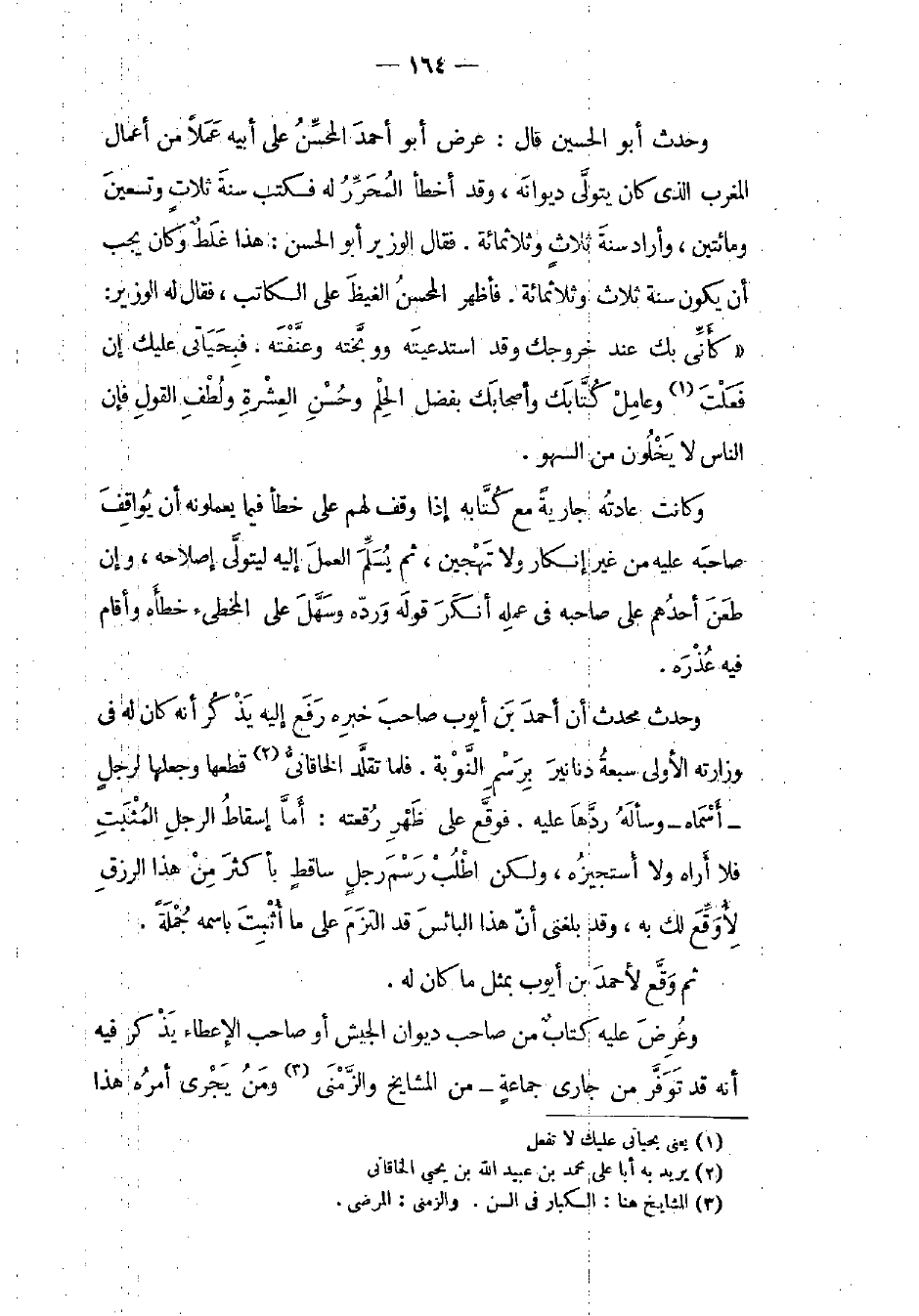وحدث أبو الحسين قال: عرض أبو أحمد المحسن على أبيه عملاً من أعمال المغرب الذي كان يتولى ديوانه، وقد أخطأ المحرر له فكتب سنة ثلاث وتسعين ومائتين، وأراد سنة ثلاث وثلاثمائة. فقال الوزير أبو الحسن: هذا غلط وكان يجب أن يكون سنة ثلاث وثلاثمائة. فأظهر المحسن الغيظ على الكاتب، فقال له الوزير: كأني بك عند خروج وقد استدعيته ووبخته وعنفته. فبحياتي عليك إن فعلت وعامل كتابك وأصحابك بفضل الحلم وحسن العشرة ولطف القول فإن الناس لا يخلون من السهو. وكانت عادته جاريةً مع كتابه إذا وقف لهم على خطأ فيما يعملونه أن يواقف صاحبه عليه من غير إنكار ولا تهجين، ثم يسلم العلم إليه ليتولى إصلاحه، وإن طعن أحدهم على صاحبه في عمله أنكر قوله ورده وسهل على المطئ خطأه وأقام فيه عذره. وحدث محدث أن أحمد بن أيوب صاحب خبره رفع إليه يذكر أنه كان له في وزارته الأولى سبعة دنانير برسم النوبة. فلما تقلد الخاقاني قطعها وجعلها لرجل أسماه وسأله ردها عليه، فوقع على ظهر رقعته: أما إسقاط الرجل المثبت فلا أراه ولا أستجيزه، ولكن اطلب رسم رجل ساقط بأكثر من هذا الرزق لأوقع لك به، وقد بلغني أن هذا البائس قد التزم على ما أثبت باسمه جملةً. ثم وقع لأحمد بن أيوب بمثل ما كان له. وعرض عليه كتاب من صاحب ديوان الجيش أو صاحب الإعطاء يذكر فيه أنه قد توفر من جاري جماعة من المشايخ والزمني ومن يجري أمره هذا
