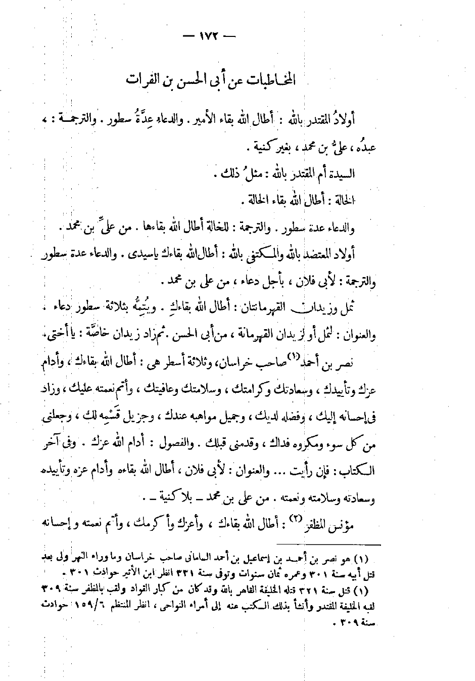 أولاد المقتدر بالله: أطال الله بقاء الأمير. والدعاء عدة سطور. والترجمة: عبده، علي بن محمد، بغير كنية، السيدة أم المقتدر بالله: مثل ذلك، الخالة: أطال الله بقاء الخالة. والدعاء عدة سطور. والترجمة: للخالة أطال الله بقاءها. من علي بن محمد، أولاد المعتضد بالله والمكتفي بالله: أطال الله بقاءك يا سيدي. والدعاء عدة سطور والترجمة: لأبي فلان، بأجل دعاء، من علي بن محمد. ثمل وزيدان القهرمانتان: أطال الله بقاءك. ويتمه بثلاثة سطور دعاء. والعنوان: لثمل أو لزيدان القهرمانة، من أبي الحسن. ثم زاد زيدان خاصة: يا أختي. نصر بن أحمد صاحب خراسان، وثلاثة أسطر هي: أطال الله بقاءك، وأدام عزك وتأييدك، وسعادتك وكرامتك، وسلامتك وعافيتك، وأتم نعمته عليك، وزاد في إحسانه إليك، وفضله لديك، وجميل مواهبه عندك، وجزيل قسمه لك، وجعلني من كل سوء ومكروه فداك، وقدمني قبلك. والفصول: أدام الله عزك. وفي آخر الكتاب: فإن رأيت ... والعنوان: لأبي فلان، أطال الله بقاءه وأدام عزه وتأييده وسعادته وسلامته ونعمته. من علي بن محمد بلا كنية. مؤنس المظفر: أطال الله بقاءك، وأعزك وأكرمك، وأتم نعمته وإحسانه