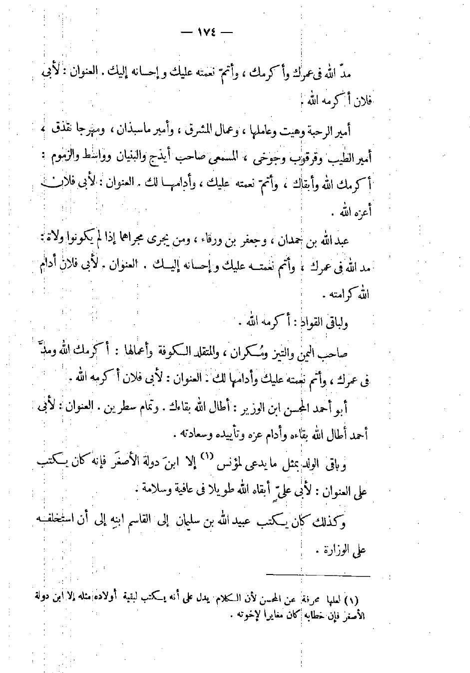 مد الله في عمرك وأكرمك، وأتم نعمته عليك وإحسانه إليك. العنوان: لأبي فلان أكرمه الله. أمير الرحبة وهيت وعاملها، وعمال المشرق، وأمير ماسبذان، ومهرجان نقذق، أمير الطيب وقرقوب وجوخي، المسمعي صاحب أيذج والبنيان وواسط والزموم: أكرمك الله وابقاك، وأتم نعمته عليك، وأدامها لك. العنوان: لأبي فلان أعزه الله. عبد الله بن حمدان، وجعفر بن ورقاء، ومن يجري مجراها إذا لم يكونوا ولاة: مد الله في عمرك، وأتم نعمته عليك وإحسانه إليك. العنوان: لأبي فلان أدام الله كرامته. ولباقي القواد: أكرمه الله. صاحب اليمن والتيز ومكران، والمتقلد الكوفة وأعمالها: أكرمك الله ومد في عمرك، وأتم نعمته عليك وأدامها لك. العنوان: لأبي فلان أكرمه الله.