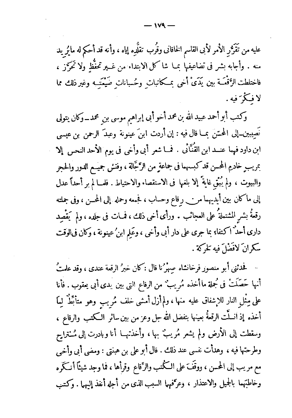 عليه من تقرر الأمر لأبي القاسم الخاقاني وقرب تقلده إياه، وأنه قد أحكم له ما يريد منه. وأجابه بشر في تضاعيفها بما شاكل الابتداء من غير تحفظ ولا تحرز، فاختلطت الرقعة بين يدي أخي بمكاتبات وحسبانات ضيعته وغير ذلك مما لا فكر فيه.