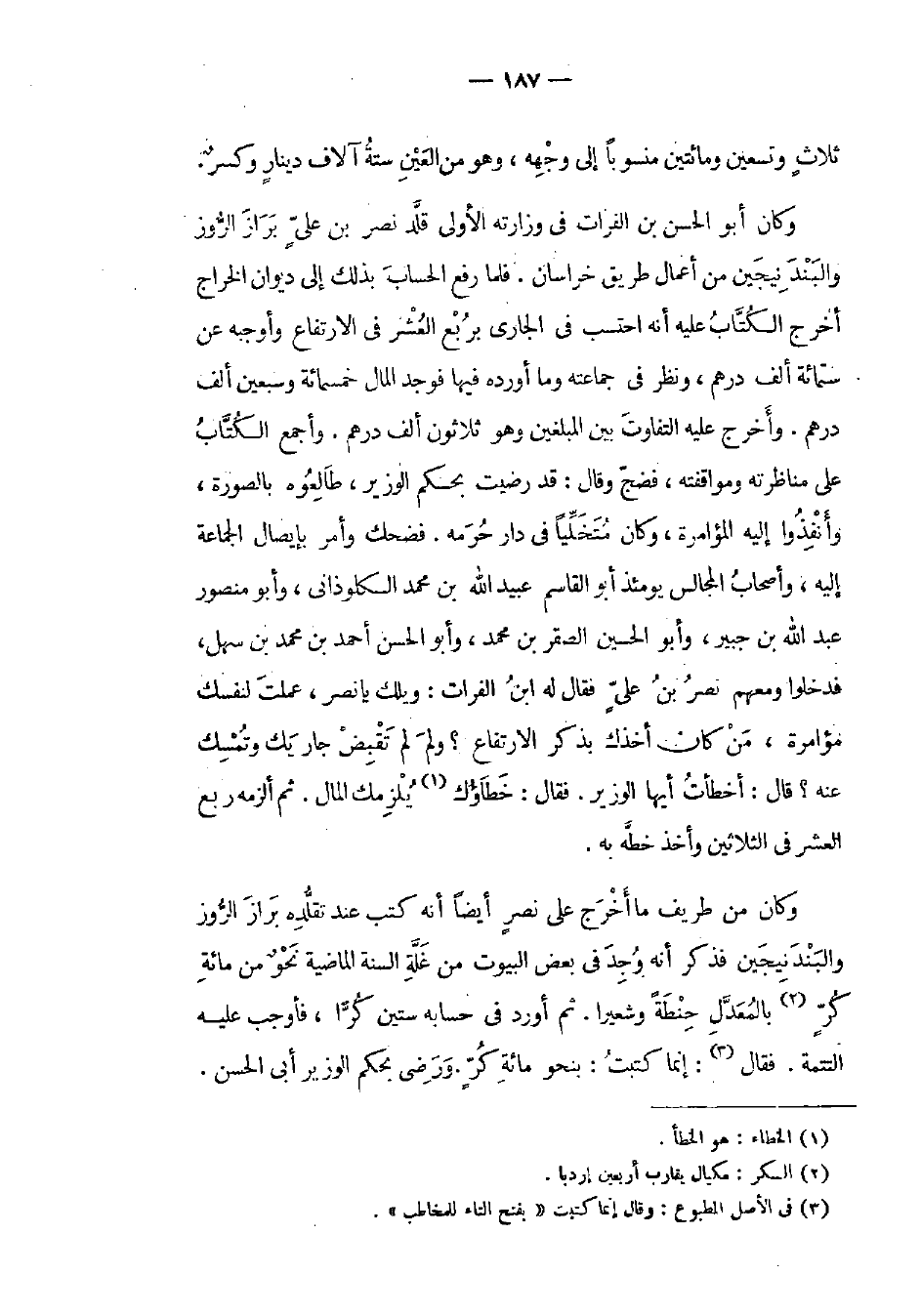 وكان أبو الحسن بن الفرات في وزارته الأواى قلد نصر بن علي براز الروز والبند نيجين من أعمال طريق خراسان. فلما رفع الحسان بذلك إلى ديوان الخراج أخرج الكتاب عليه أنه احتسب في الجاري بربع العشر في الارتفاع وأوجبه عن ستمائة ألف درهم، ونظر في جماعته وما أورده فيها فوجد المال خمسمائة وسبعين ألف درهم. وأخرج عليه التفاوت بين المبلغين وهو ثلاثون ألف درهم. وأجمع الكتاب على مناظرته ومواقفته، فضج وقال: قد رضيت بحكم الوزير، طالعوه بالصورة، وأنقذوا إليه المؤامرة، وكان متخلياً في دار حرمه. فضحك وأمر بإيصال الجماعة إليه، وأصحاب المجالس يومئذ أبو القاسم عبيد الله بن محمد الكلوذاني، وأبو منصور عبد الله بن جبير، وأبو الحسين الصقر بن محمد، وأبو الحسن أحمد بن محمد بن سهل، فدخلوا ومعهم نصر بن علي فقال له ابن الفرات: ويلك يا نصر، عملت لنفسك مؤامرة، من كان أخذك بذكر الارتفاع؟ ولم لم تقبض جاريك وتمسك عنه؟ قال: أخطأت أيها الوزير. فقال: خطاؤك يلزمك المال. ثم ألزمه ربع العشر في الثلاثين وأخذ خطه به. وكان من طريق ما أخرج على نصر أيضاً أنه كتب عند تقلد براز الروز والبندنيجين فذكر أنه وجد في بعض البيوت من غلة السنة الماضية نحو من مائة كر بالمعدل حنطةً وشعيراً. ثم أورد في حسابه ستين كراً، فأوجب عليه التتمة. فقال: إنما كتبت: بنحو مائة كر. ورضي بحكم الوزير أبي الحسن.