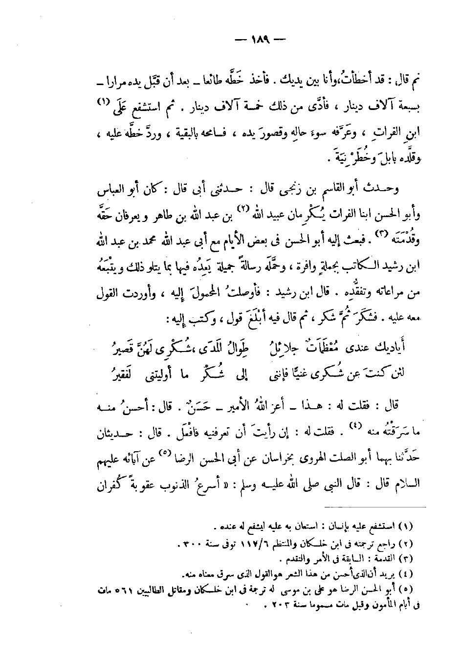 قال: فقلت له: هذا أعز الله الأمير حسن. قال: أحسن منه ما سرقته منه. فقلت له: إن رأيت أن تعرفنيه فافعل. قال: حديثان حدثنا بهما أبو الصلت الهروي بخراسان عن أبي الحسن الرضا عن آبائه عليهم السلام قال: قال النبي صلى الله عليه وسلم: أسرع الذنوب عقوبةً كفران