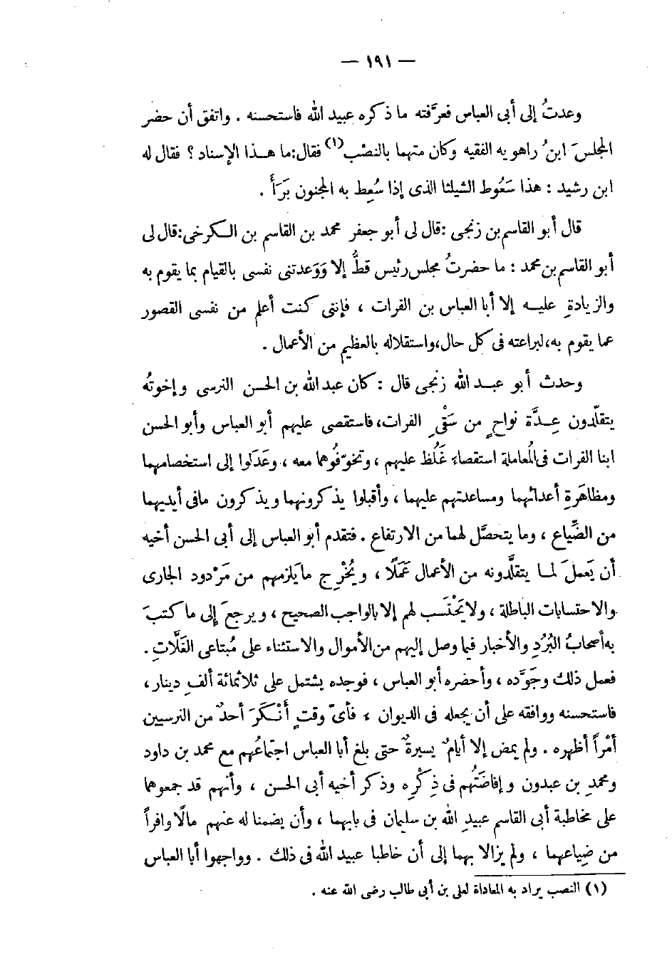 قال أبو القاسم بن زنجي: قال لي أبو جعفر محمد بن القاسم بن الكرخي: قال لي أبو القاسم بن محمد: ما حضرت مجلس رئيس قط إلا ووعدتني نفسي بالقيام بما يقوم به والزيادة عليه إلا أبا العباس بن الفرات، فإنني كنت أعلم من نفسي لقصور عما يقوم به، لبراعته في كل حال، واستقلاله بالعظيم من الأعمال. وحدث أبو عبد الله زنجي قال: كان عبد الله بن الحسن النرسي وإخوته يتقلدون عدة نواح من سقي الفرات، فاستقصى عليهم أبو العباس وأبو الحسن ابنا الفرات في المعاملة استقصاءً غلظ عليهم، وتخوفوهما معه، وعدلوا إلى استخصامهما ومظاهرة أعدائهما ومساعدتهم عليهما، وأقبلوا يذكرونهما ويذكرون ما في أيديهم من الضياع، وما يتحصل لهما من الارتفاع. فتقدم أبو العباس إلى أبي الحسن أخيه أن يعمل لما يتقلدونه من الأعمال عملاً، ويخرج ما يلزمهم من مردود الجاري والاحتسابات الباطلة، ولا يحتسب لهم إلا بالواجب الصحيح، ويرجع إلى ما كتب به أصحاب البرد والأخبار فيما وصل إليهم من الأموال والاستثناء على مبتاعي الغلات. فعمل ذلك وجوده، وأحضره أبو العباس، فوجده يشتمل على ثلاثمائة ألف دينار، فاستحسنه ووافقه على أن يجعله في الديوان، فأي وقت أنكر أحد من النرسيين أمراً أظهره. ولم يمض إلا أيام يسيرة حتى بلغ أبا العباس اجتماعهم مع محمد بن داود ومحمد بن عبدون وإفاضتهم في ذكره وذكر أخيه أبي الحسن، وأنهم قد جمعوهما على مخاطبة أبي القاسم عبيد الله بن سليمان في بابهما، وأن يضمنا له عنهم مالاً وافراً من ضياعهما، ولم يزالا بهما إلى أن خاطبا عبيد الله في ذلك. وواجهوا أبا العباس