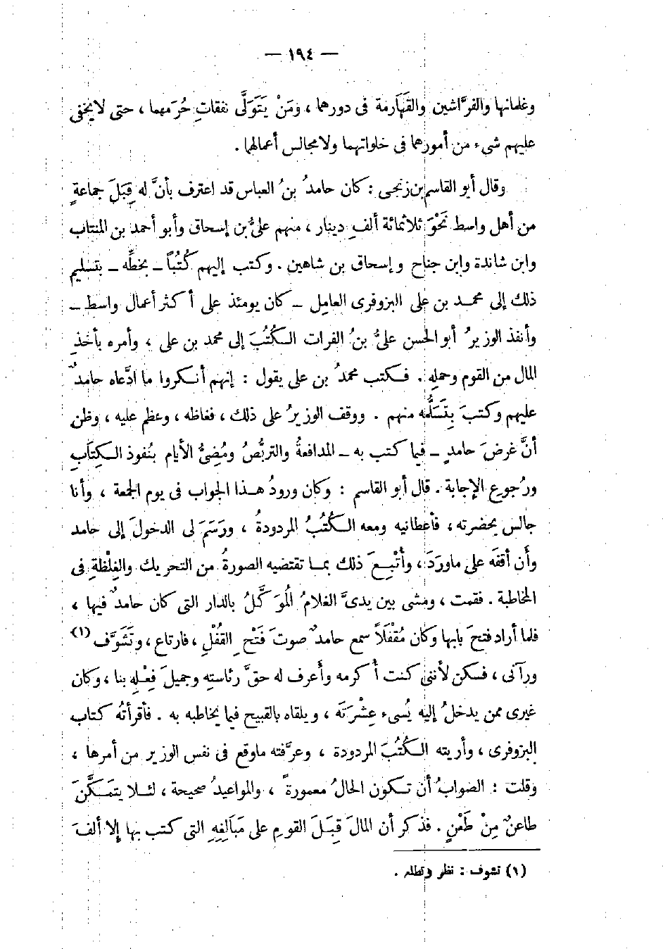 وغلمانها والفراشين والقهارمة في دورهما، ومن يتولى نفقات حرمهما، حتى لا يخفى عليهم شيء من أمورهما في خلواتهما ولا مجالس أعمالهما. بما رفعوه إلى واحد واحد من أسباب أستاذنا ولم يوجد لك فيه ذكر ولا اسم. فحمدت الله وشكرته على ما وفقني له. ولما فرغ أبو العباس دعاني إلى حجرة خلوته، فدخلت وهو جالس، ومعه أخوه أبا الحسن، فشكراني على خروجي من جملة من قبل بر النرسيين وجزياني خيراً عن حفظ الأمانة، واستقامة الطريقة، وخاطباني أجمل خطاب ووعداني أحسن وعد، وحلفا على أنني قد أصبحت لديهما كأحدهما. ولم تزل الحال تزيد معها وعندهما إلى آخر المدة. وكان النرسيون بفضل عدواتهم لهما قد توصلا إلى بر كتابهما وخزانهما وغلمانها والفراشين والقهارمة في دورهما، ومن يتولى نفقات حرمهما، حتى لا يخفى عليهم شيء من أمورهما في خلواتهما ولا مجالس أعمالهما.
