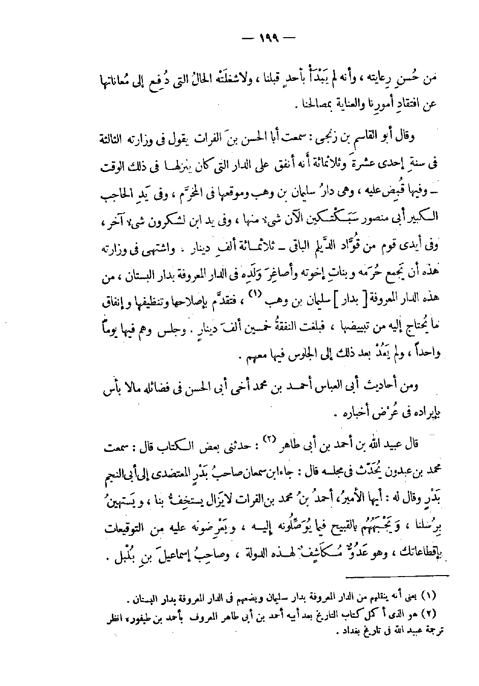 من حسن رعايته، وأنه لم يبدأ بأحد قبلنا، ولا شغلته الحال التي دفع إلى معاناتها عن افتقاد أمورنا والعناية بمصالحنا. وقال أبو القاسم بن زنجي: سمعت أبا الحسن بن الفرات يقول في وزارته الثالثة في سنة إحدى عشرة وثلاثمائة أنه أنفق على الدار التي كان ينزلها في ذلك الوقت وفيها قبض عليه، وهي دار سليمان بن وهب وموقعها في المخرم، وفي يد الحاجب الكبير أبي منصور سبكتكين الآن شيء منها، وفي يد ابن لشكرون شيء آخر، وفي أيدي قوم من قواد الديلم الباقي ثلاثمائة ألف دينار. واشتهى في وزارته هذه أن يجمع حرمه وبنات إخوته وأصاغر ولده في الدار المعروفة بدار البستان، من هذه الدار المعروفة بدار سليمان بن وهب، فتقدم بإصلاحها وتنظيفها وإنفاق ما يحتاج إليه من تبييضها، فبلغت النفقة خمسين ألف دينار. وجلس وهم فيها يوماً واحداً، ولم يعد بعد ذلك إلى الجلوس فيها معهم.