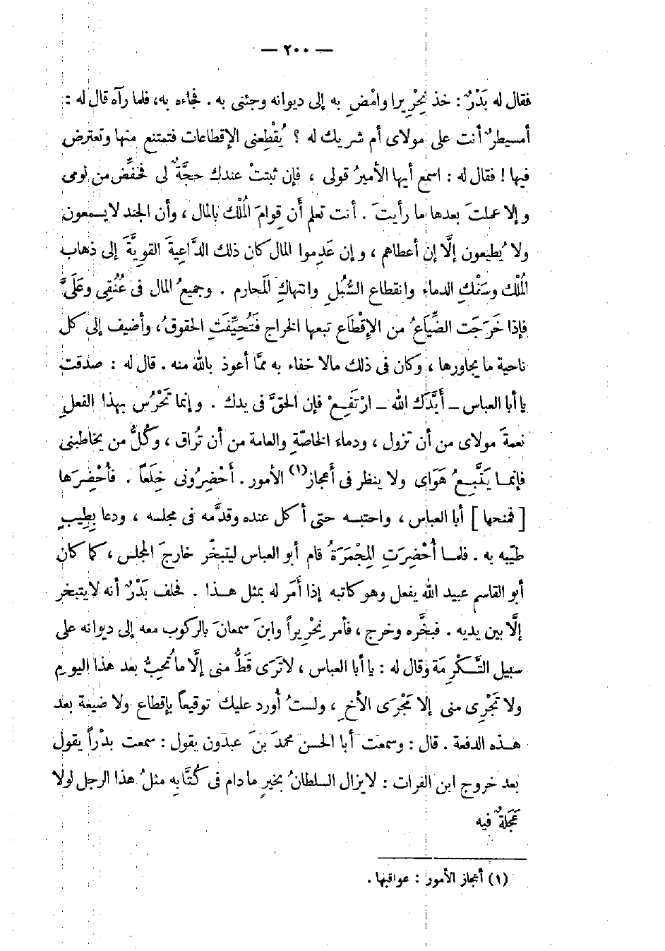 فقال له بدر: خذ نحريراً وامض به إلى ديوانه وجئني به. فجاءه به، فلما رآه قال له: أمسيطر أنت على مولاي أم شريك له؟ يقطعني الإقطاعات فتمتنع منها وتعترض فيها! فقال له: اسمع أيها الأمير قولي، فإن ثبتت عندك حجة لي فخفض من لومي وإلا عملت بعدها ما رأيت. أنت تعلم أن قوام الملك بالمال، وأن الجند لا يسمعون ولا يطيعون إلا إن أعطاهم، وإن عدموا المال كان ذلك الداعية القوية إلى ذهاب الملك وسفك الدماء وانقطاع السبل وانتهاك المحارم. وجميع المال في عنقي وعلي فأذا خرجت الضياع من الإقطاع تبعها الخراج فتحيفت الحقوق، وأضيف إلى كل ناحية ما يجاورها، وكان في ذلك مالاً خفاء به مما أعوذ بالله منه. قال له: صدقت يا أبا العباس أيدك الله ارتفع فإن الحق في يدك. وإنما تحرس بهذا الفعل نعمة مولاي من أن تزول، ودماء الخاصة والعامة من أن تراق، وكل من يخاطبني فإنما يتبع هواي ولا ينظر في أعجاز الأمور. أحضروني خلعاً. فأُحضرها فمنحها أبا العباس، واحتسبه حتى أكل عنده وقدمه في مجلسه، ودعا بطيب طيبه به. فلما أُحضرت المجمرة قام أبو العباس ليتبخر خارج المجلس، كما كان أبو القاسم عبيد الله يفعل وهو كاتبه إذا أمر له بمثل هذا. فحلف بدر أنه لا يتبخر إلا بين يديه. فبخره وخرج، فأمر نحريراً وابن سمعان بالركوب معه إلى ديوانه على سبيل التكرمة وقال له: يا أبا العباس، لا ترى قط من إلا ما تحب بعد هذا اليوم ولا تجري مني إلا مجرى الأخ، ولست أُورد عليك توقيعاً بإقطاع ولا ضيعة بعد هذه الدفعة. قال: وسمعت أبا الحسن محمد بن عبدون يقول: سمعت بدراً يقول بعد خروج ابن الفرات: لا يزال السلطان بخير ما دام في كتابه مثل هذا الرجل لولا عجلة فيه.