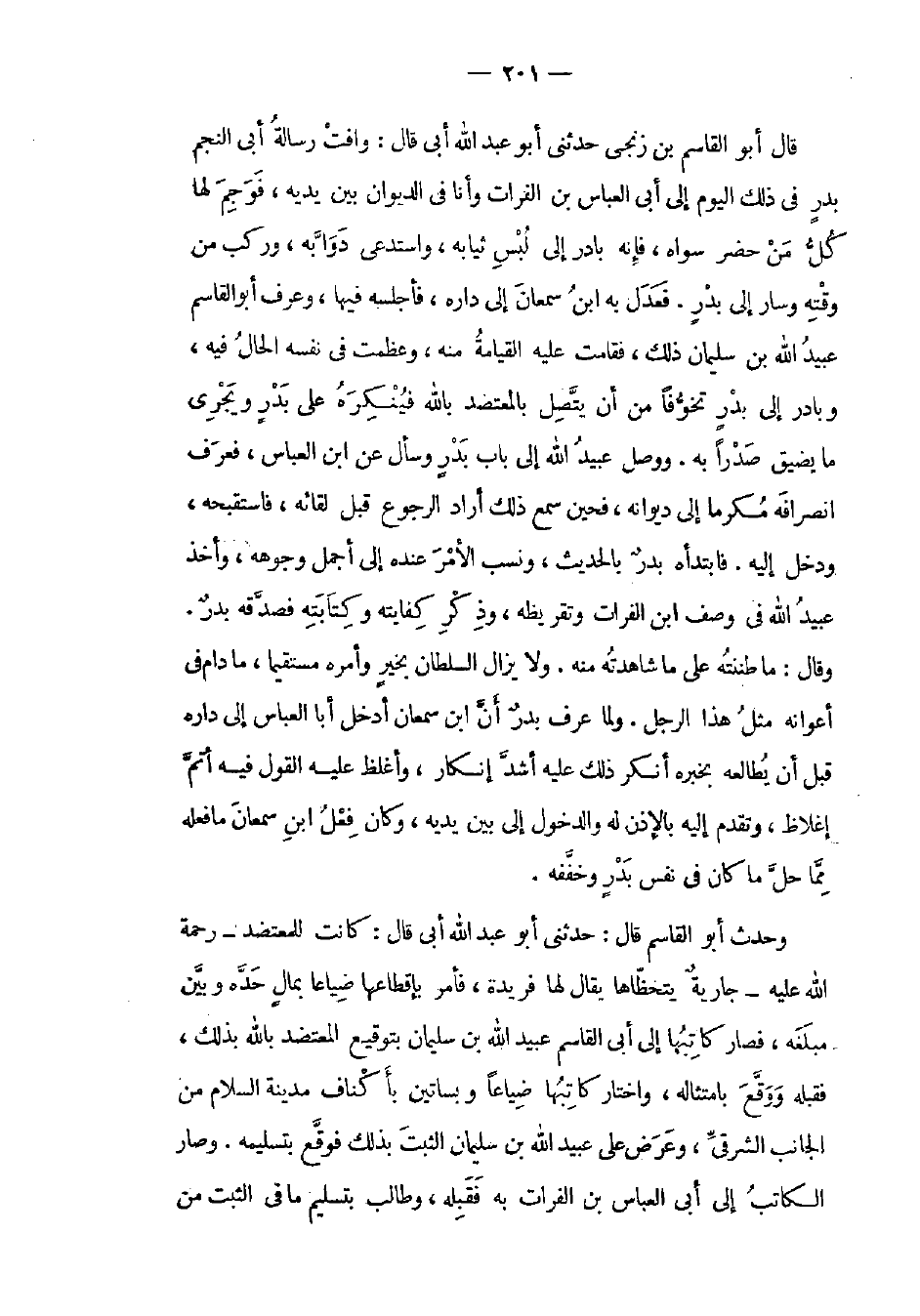 قال أبو القاسم بن زنجي حدثني أبو عبد الله أبي قال: وافت رسالة أبي النجم بدر في ذلك اليوم إلى أبي العباس بن الفرات وأنا في الديوان بين يديه، فوجم لها كل من حضر سواه، فإنه بادر إلى لبس ثيابه، واستدعى دوابه، وركب من وقته وسار إلى بدر. فعدل به ابن سمعان إلى داره، فأجلسه فيها، وعرف أبو القاسم عبيد الله بن سليمان ذلك، فقامت عليه القيامة منه، وعظمت في نفسه الحال فيه، وبادر إلى بدر تخوفاً من أن يتصل بالمعتضد بالله فينكره على بدر ويجري ما يضيق صدراً به. ووصل عبيد الله إلى باب بدر وسأل عن ابن العباس، فعرف انصرافه مكرماً إلى ديوانه، فحين سمع ذلك أراد الرجوع قبل لقائه، فاستقبحه، ودخل إليه. فابتدأه بدر بالحديث، ونسب الأمر عنده إلى أجمل وجوهه، وأخذ عبيد الله في وصف ابن الفرات وتقريظه، وذكر كفايته وكتابته فصدقه بدر. وقال: ما ظننه على ما شاهدته منه. ولا يزال السلطان بخير وأمره مستقيماً، ما دام في أعوانه مثل هذا الرجل. ولما عرف بدر أن ابن سمعان أدخل أبا العباس إلى داره قبل أن يطالعه بخبره أنكر ذلك عليه أشد إنكار، وأغلظ عليه القول فيه أتم إغلاظ، وتقدم إليه بالإذن له والدخول إلى بين يديه، وكان فعل ابن سمعان ما فعله مما حل ما كان في نفس بدر وخففه.