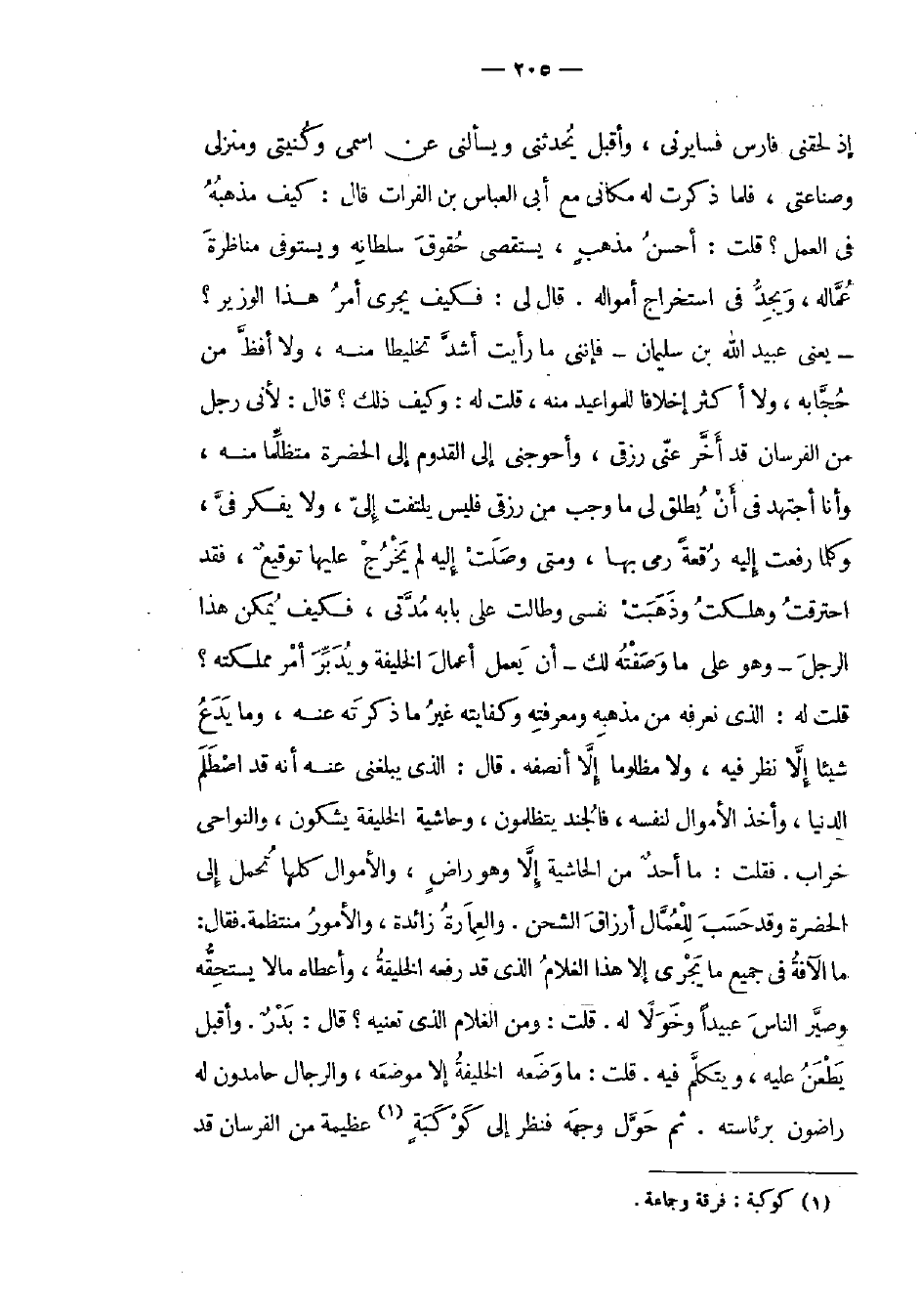 إذ لحقني فارس فسايرني، وأقبل يحدثني ويسألني عن اسمي وكنيتي ومنزلي وصناعتي، فلما ذكرت له مكاني مع أبي العباس بن الفرات قال: كيف مذهبه في العمل؟ قلت: أحسن مذهب، يستقصي حقوق سلطانه ويستوفي مناظرة عماله، ويجد في استخراج أمواله. قال لي: فكيف يجري أمر هذا الوزير؟ يعني عبيد الله بن سليمان فإنني ما رأيت أشد تخليطاً منه، ولا أفظ من حجابه، ولا أكثر إخلافاً للمواعيد منه، قلت له: وكيف ذلك؟ قال: لأني رجل من الفرسان قد أخر عني رزقي، وأحوجني إلى القدوم إلى الحضرة متظلماً منه، وأنا أجتهد في أن يطلق لي ما وجب من رزقي فليس يلتفت إلي، ولا يفكر في، وكلما رفعت إليه رقعةً رمى بها، ومتى وصلت إليه لم يخرج عليها توقيع، فقد احترقت وهلكت وذهبت نفسي وطالت على بابه مدتي، فكيف يمكن هذا الرجل وهو على ما وصفته لك أن يعمل أعمال الخليفة ويدبر أمر مملكته؟ قلت له: الذي نعرفه من مذهبه ومعرفته وكفايته غير ما ذكرته عنه، وما يدع شيئاً إلا نظر فيه، ولا مظلوماً إلا أنصفه. قال: الذي يبلغني عنه أنه قد اصطلم الدنيا، وأخذ الأموال لنفسه، فالجند يتظلمون، وحاشية الخليفة يشكون، والنواحي خراب. فقلت: ما أحد من الحاشية إلا وهو راض، والأموال كلها تحمل إلى الحضرة وقد حسب للعمال أرزاق الشحن. والعمارة زائدة، والأمور منتظمة. فقال: ما الآفة في جميع ما يجري إلا هذا الغلام الذي قد رفعه الخليفة، وأعطاه ما لا يستحقه وصير الناس عبيداً وخولاً له. قلت: ومن الغلام الذي تعنيه؟ قال: بدر. وأقبل يطعن عليه، ويتكلم فيه. قلت: ما وضعه الخليفة إلا موضعه، والرجال حامدون له راضون برئاسته. ثم حول وجهه فنظر إلى كوكبة عظيمة من الفرسان قد