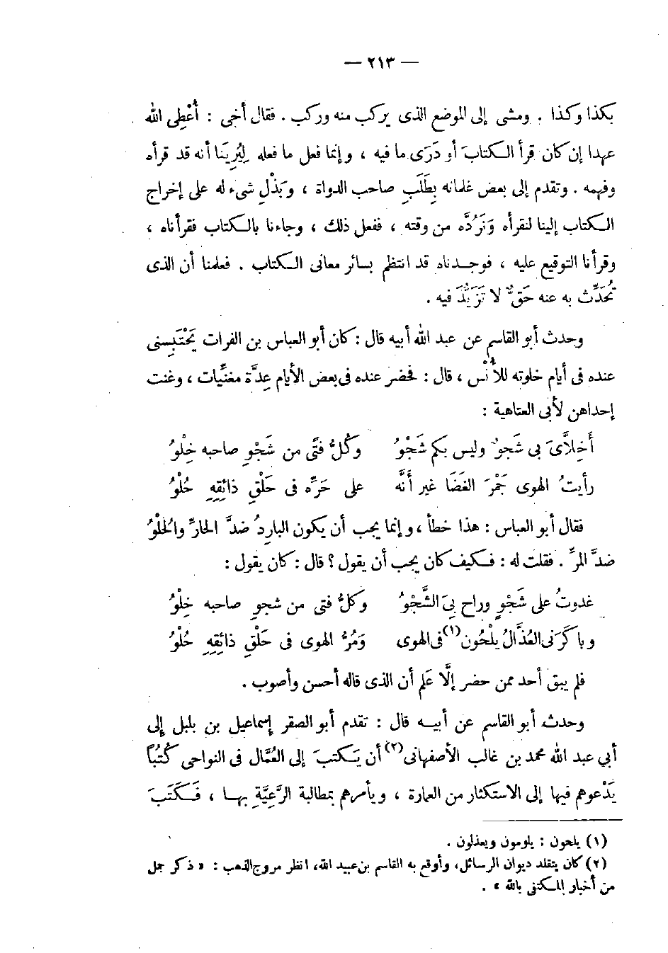 بكذا وكذا. ومشى إلى الموضع الذي يركب منه وركب. فقال أخي: أُعطي الله عهداً إن كان قرأ الكتاب أو درى ما فيه، وإنما فعل ما فعله ليرينا أنه قد قرأه وفهمه. وتقدم إلى بعض غلمانه بطلب صاحب الدواة، وبذل شيء له على إخراج الكتاب إلينا لنقرأه ونرده من وقته، ففعل ذلك، وجاءنا بالكتاب فقرأناه، وقرأنا التوقيع عليه، فوجدناه قد انتظم بسائر معاني الكتاب. فعلمنا أن الذي تحدث به عنه حق لا تزيد فيه.
