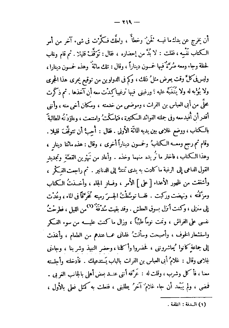 أن يخرج عن يدك ما فيه لحن وخطأ، ولعلك فكرت في شيء آخر من أمر الكتاب نفسه، فقلت: لا بد من إحضاره، فقال: توقف قليلاً. ثم قام وغاب لحظة وجاء ومعه صرة فيها خمسون ديناراً، وقال: تلك مائة وهذه خمسون ديناراً، وليس في كل وقت يعرض مثل ذلك، وكم في الدواوين من توقيع يجري هذا المجرى ولا يؤبه له ولا يتنبه عليه؟ ورغبني فيها ترغيباً كدت معه أن آخذها. ثم ذكرت محلي من أبي العباس بن الفرات، وموضعي من خدمته، ومكان أخي منه، وأنني أقدر أن أفيد معه وفي جملته الفوائد الكثيرة، فتماسكت وامتنعت، وعاودته المطالبة بالكتاب، ووضع غلامي بين يديه المائة الأولى. فقال: أحب أن تتوقف قليلاً. وقام ثم رجع ومعه الكتاب وخمسون ديناراً أخرى، وقال: هذه مائتا دينار، وهذا الكتاب، فاختر ما تريده منهما وخده. وأعاد من تهوين القصة وتجديد القول الداعي إلى الرغبة ما كادت به يدي تمتد إلى الدنانير. ثم راجعت الفكر، وأشفقت من ظهور الأعداء على الأمر، وفساد الجاه، وأخذت الكتاب ومزقته، ونهضت وركبت. فلما توسطت الجسر رميته مخرقاً في الماء، وعدت إلى منزلي، وكنت أنزل بسوق العطش. وقد بقيت سدفة من الليل، فطرحت نفسي على الفراش، ونمت نوماً طيباً، وزال ما كنت عليه من سوء الفكر واستشعار الخوف، وأصبحت وسألت غلماني عما عندهم من الطعام، وأنفذت إلى جماعة كانوا يعاشرونني، فحضروا وأكلنا، وحضر النبيذ وشربنا، وجاءني غلامي وقال: غلام أبي العباس بن الفرات بالباب يستدعيك. فأدخلته وأجلسته معنا، فأكل وشرب، وقلت له: عرفه أنني عند بعض أهلي بالجانب الغربي. فمضى، ولم يبعد أن جاء غلام آخر يطلبني، ففعلت به كمثل فعلي بالأول.