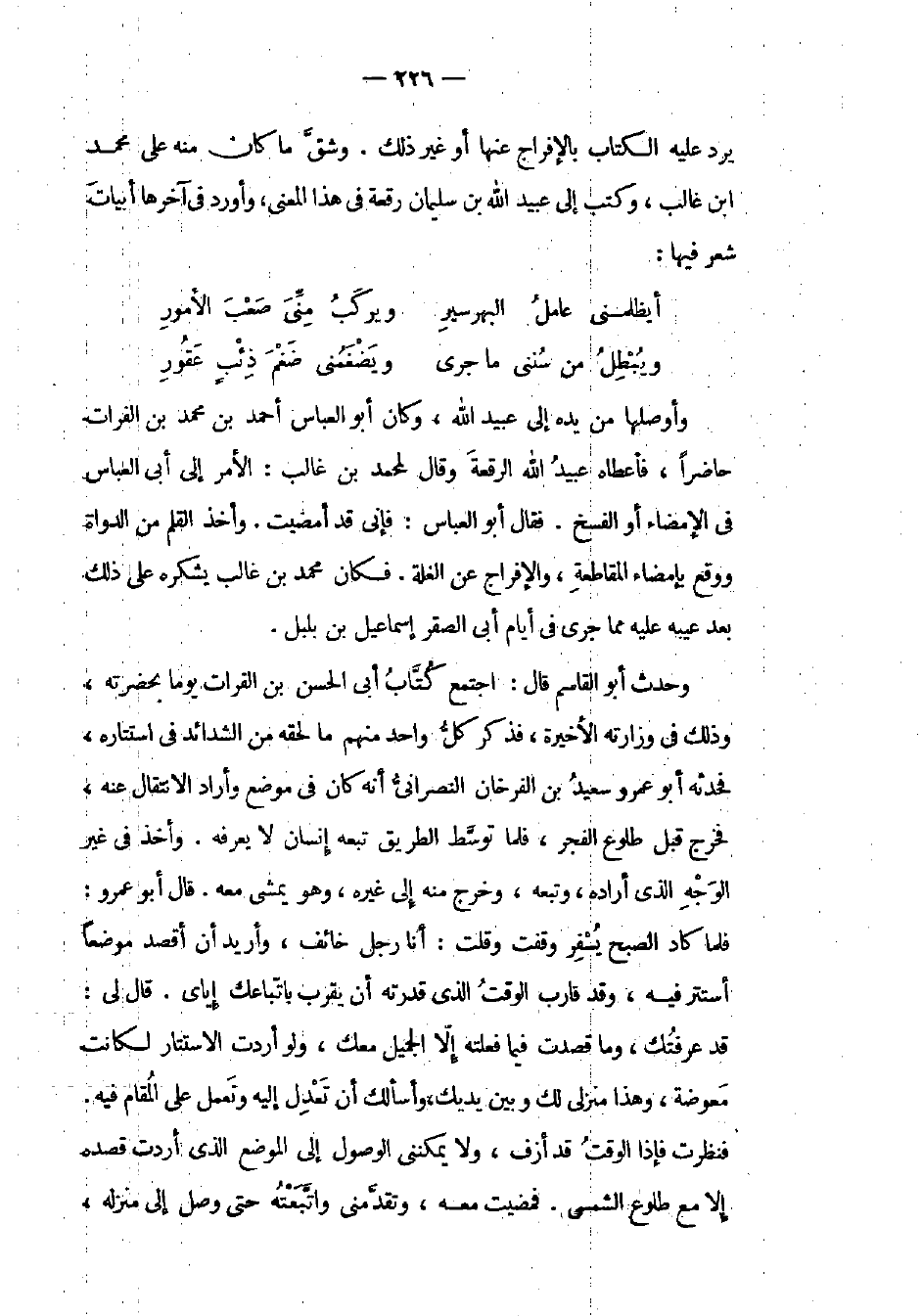 يرد عليه الكتاب بالإفراج عنها أو غير ذلك. وشق ما كان منه على محمد ابن غالب، وكتب إلى عبيد الله بن سليمان رقعة في هذا المعنى، وأورد في آخرها أبيات شعر فيها: