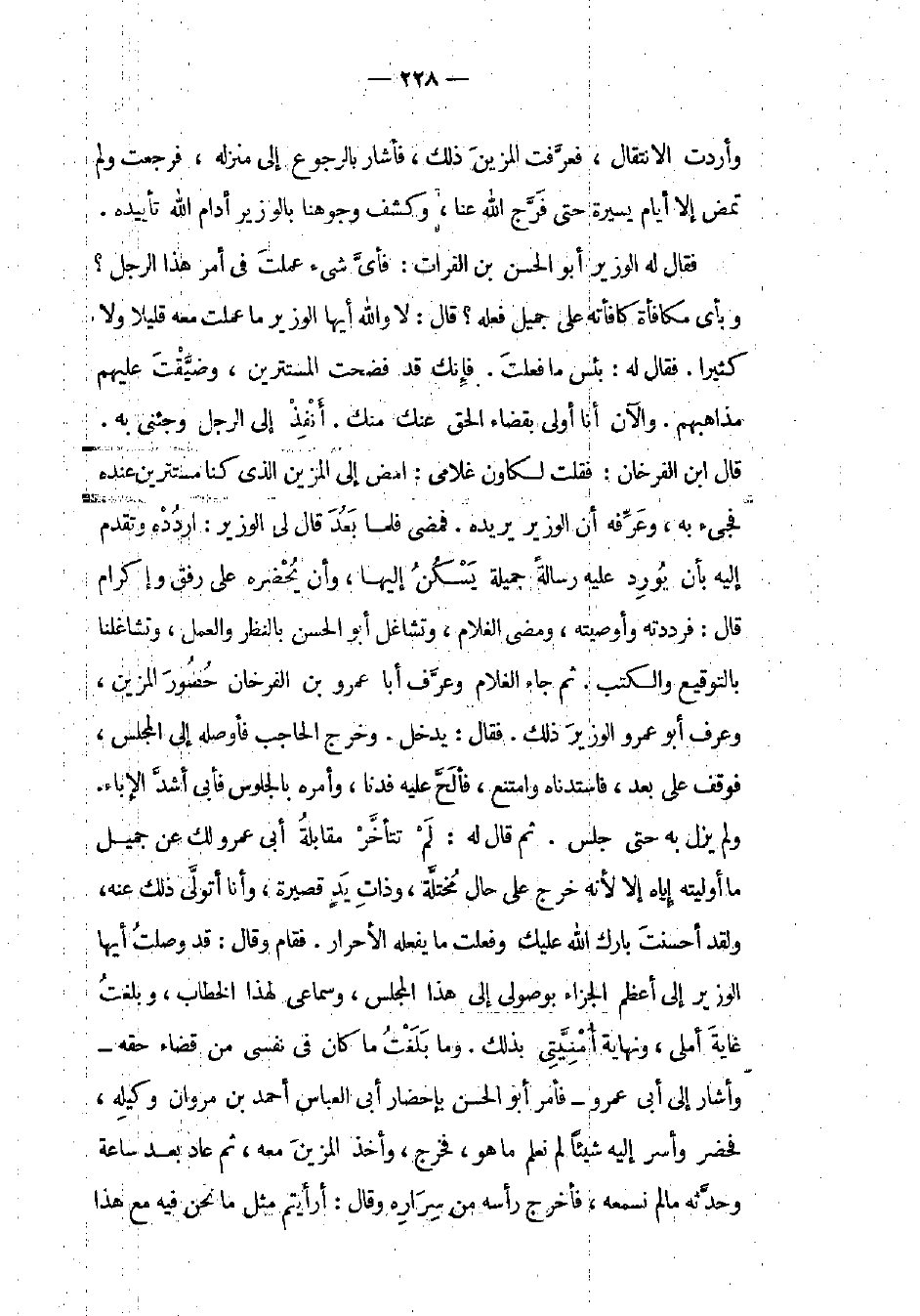 فقال له الوزير أبو الحسن بن الفرات: فأي شيء عملت في أمر هذا الرجل؟ وبأي مكافأة كافأته على جميل فعله؟ قال: لا والله أيها الوزير ما عملت معه قليلاً ولا كثيراً. فقال له: بئس ما فعلت. فإنك قد فضحت المستترين، وضيقت عليهم مذاهبتهم. والآن أنا أولى بقضاء الحق عنك منك. أنفذ إلى الرجل وجئني به. قال ابن الفرخان: فقلت لكاون غلامي: امض إلى المزين الذي كنا مستترين عنده فجيء به، وعرفه أن الوزير يريده. فمضى فلما بعد قال لي الوزير: أردده وتقدم إليه بأن يورد عليه رسالة جميلة يسكن إليها، وأن يحضره على وفق وإكرام قال: فرددته وأوصيته، ومضى الغلام، وتشاغل أبو الحسن بالنظر والعمل، وتشاغلنا بالتوقيع والكتب. ثم جاء الغلام وعرف أبا عمرو بن الفرخان حضور المزين، وعرف أبو عمرو الوزير ذلك. فقال: يدخل. وخرج الحاجب فأوصله إلى المجلس، فوقف على بعد، فاستدناه وامتنع، فألح عليه فدنا، وأمره بالجلوس فأبى أشد الإباء. ولم يزل به حتى جلس. ثم قال له: لم تتأخر مقابلة أبي عمرو لك عن جميل ما أوليته إياه إلا لأنه خرج على حال مختلة، وذات يد قصيرة، وأنا أتولى ذلك عنه، ولقد أحسنت بارك الله عليك وفعلت ما يفعله الأحرار. فقام وقال: قد وصلت أيها الوزير إلى أعظم الجزاء بوصولي إلى هذا المجلس، وسماعي لهذا الخطاب، وبلغت غاية أملي، ونهاية أمنيتي بذلك. وما بلغت ما كان في نفسي من قضاء حقه وأشار إلى أبي عمرو فأمر أبو الحسن بإحضار أبي العباس أحمد بن مروان وكيله، فحضر وأسر إليه شيئاً لم نعلم ما هو، فخرج وأخذ المزين معه، ثم عاد بعد ساعة وحدثه ما لم نسمعه، فأخرج رأسه من سراره وقال: أرأيتم مثل ما نحن فيه مع هذا