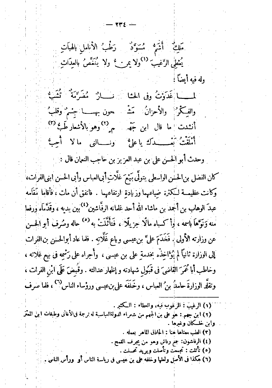كان الفضل بن الحسن الواسطي يتولى بيع غلات أبي العباس وأبي الحسن ابني الفرات، وكانت عظيمة لكثرة ضياعهما وزيادة ارتفاعهما. فاتفق أن مات، فأقاما مقامه عبد الوهاب بن أحمد بن ما شاء الله أحد غلمانه الرفاشين بين يديه، وقدماه ورفعا منه ونوها باسمه، وأكسباه مالاً جزيلاً، فتأثلت به حاله وصرف أبو الحسن عن وزارته الأولى. فخدم علي بن عيسى وباع غلاته. فلما عاد أبو الحسن بن الفرات إلى الوزارة ثانياً لم يؤاخذه بخدمة علي بن عيسى، وأجراه على رسمه في بيع غلاته، وخاطب أبا عمر القاضي في قبول شهادته وإظهار عدالته. وقبض علي بن الفرات، وتقلد الوزارة حامد بن العباس، وخلفه علي بن عيسى ورؤساء الناس، فلما صرف