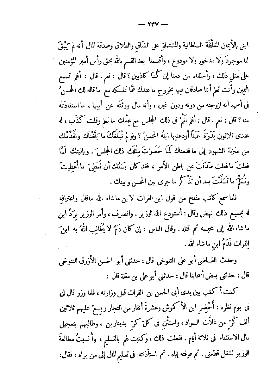 ابني بالأيمان المغلظة السلطانية والمشتملة على العتاق والطلاق وصدقة المال أنه لم يبق لنا موجود ولا مذخور ولا مودوع، وأقسمنا بعد القسم بالله بحق رأس أمير المؤمنين على مثل ذلك، وأحللناه من دمنا إن كنا كاذبين؟ قال: نعم. قال: أفلم تسمع اليمين وأنت تعلم أننا صادقان فيها بخروج ما عندك عما نملكه مع ما قاله لك المحسن في أمره أنه لزوجته من دونه ودون