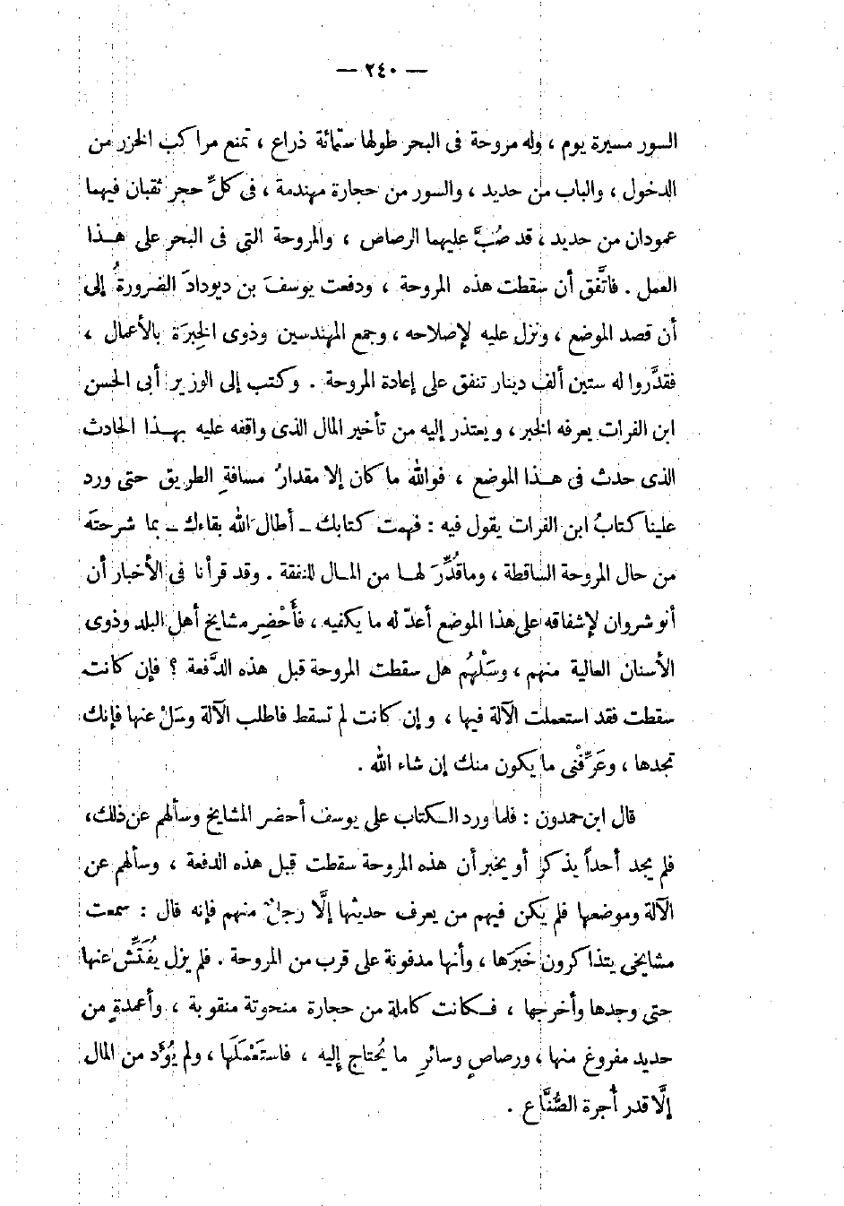 السور مسيرة يوم، وله مروحة في البحر طولها ستمائة ذراع، تمنع مراكب الخزر من الدخول، والباب من حديد، والسور من حجارة مهندمة، في كل حجر ثقبان فيهما عمودان من حديد، قد صب عليهما الرصاص، والمروحة التي في البحر على هذا العمل. فاتفق أن سقطت هذه المروحة، ودفعت يوسف بن ديوداد الضرورة إلى أن قصد الموضوع، ونزل عليه لإصلاحه، وجمع المهندسين وذوي الخبرة بالأعمال، فقدروا له ستين ألف دينار تنفق على إعادة المروحة. وكتب إلى الوزير أبي الحسن ابن الفرات يعرفه الخبر، ويعتذر إليه من تأخير المال الذي واقفه عله بهذا الحادث الذي حدث في هذا الموضع، فوالله ما كان إلا مقدار مسافة الطريق حتى ورد علينا كتاب ابن الفرات يقول فيه: فهمت كتابك أطال الله بقاءك بما شرحته من حال المروحة الساقطة، وما قدر لها من المال للنفقة. وقد قرأنا في الأخبار أن أنوشروان لإشفاقه على هذا الموضع أعد له ما يكفيه، فأحضر مشايخ أهل البلد وذوي الأسنان العالية منهم، وسلهم هل سقطت المروحة قبل هذه الدفعة؟ فإن كانت سقطت فقد استعملت الآلة فيها، وإن كانت لم تسقط فاطلب الآلة وسل عنها فإنك تجدها، وعرفني ما يكون منك إن شاء الله. قال ابن حمدون: فلما ورد الكتاب على يوسف أحضر المشايخ وسألهم عن ذلك، فلم يجد أحداً يذكر أو يخبر أن هذه المروحة سقطت قبل هذه الدفعة، وسألهم عن الآلة وموضعها فلم يكن فيهم من يعرف حديثها إلا رجل منهم فإنه قال: سمعت مشايخي يتذاكرون خبرها، وأنها مدفونة على قرب من المروحة. فلم يزل يفتش عنها حتى وجدها وأخرجها، فكانت كاملة من حجارة منحوتة منقوبة، وأعمدة من حديد مفروع منها، ورصاص وسائر ما يحتاج إليه، فاستعملها، ولم يؤد من المال إلا قدر أجرة الصناع.