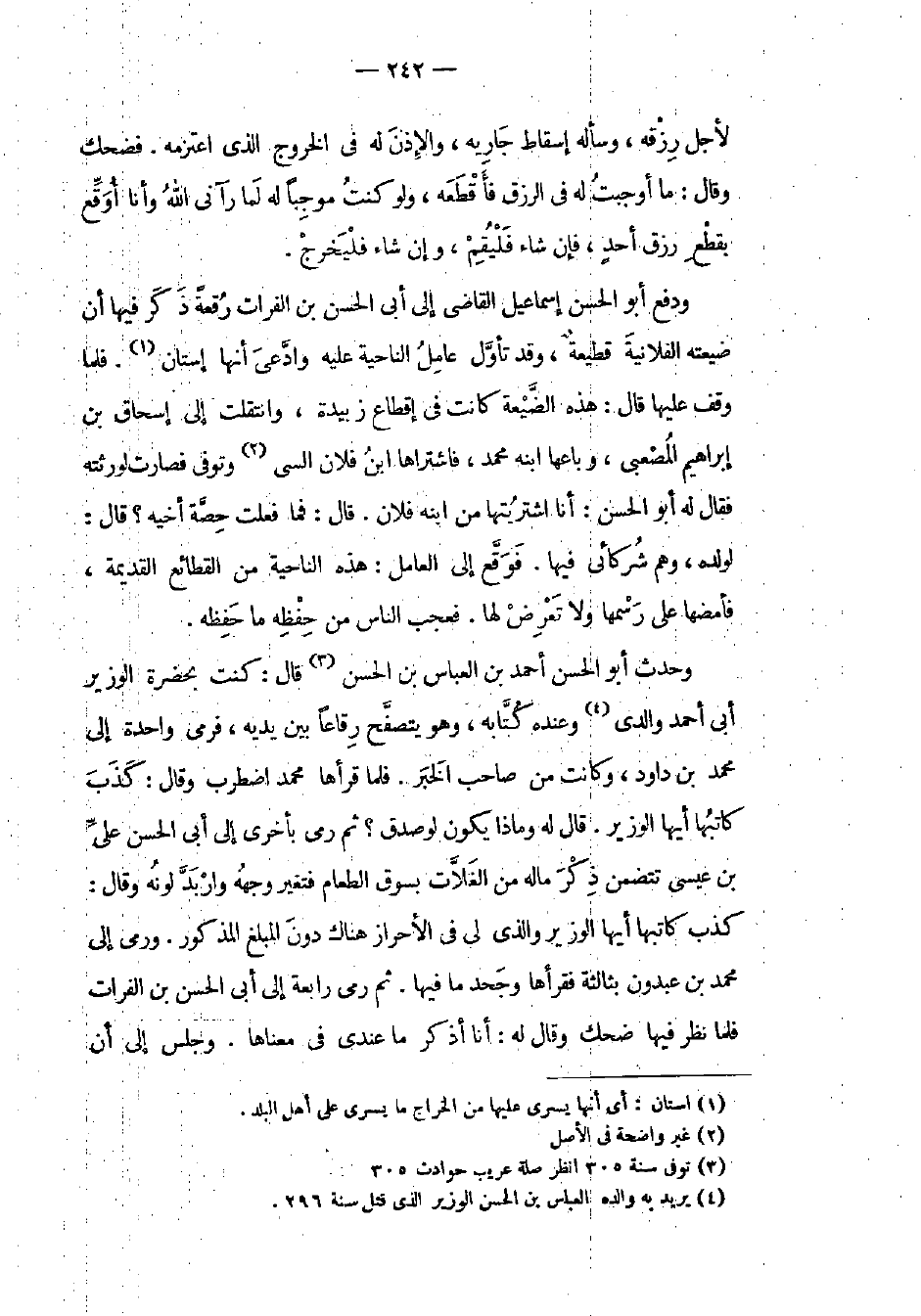 لأجل رزقه، وسأله أسقاط جاريه، والإذن له في الخروج الذي اعتزمه. فضحك وقال: ما أوجبت له في الرزق فأقطعه، ولو كنت موجباً له لما رآني الله وأنا أوقع بقطع رزق أحد، فإن شاء فليقم، وإن شاء فليخرج. ودفع أبو الحسن إسماعيل القاضي إلى أبي الحسن بن الفرات رقعةً ذكر فيها أن ضيعته الفلانية قطيعة، وقد تأول عامل الناحية عليه وادعى انها إستان. فلما وقف عليها قال: هذه الضيعة كانت في إقطاع زبيدة، وانتقلت إلى إسحاق بن إبراهيم المصعبي، وباعها ابنه محمد، فاشتراها ابن فلان السي وتوفي فصارت لورثته فقال له أبو الحسن: أنا اشتريتها من ابنه فلان. قال: فما فعلت حصة أخيه؟ قال: لولده، وهم شركائي فيها. فوقع إلى العامل: هذه الناحية من القطائع القديمة، فأمضها على رسمها ولا تعرض لها. فعجب الناس من حفظه ما حفظه. وحدث أبو الحسن أحمد بن العباس بن الحسن قال: كنت بحضرة الوزير أبي أحمد والدي وعنده كتابه، وهو يتصفح رقاعاً بين يديه، فرمى واحدة إلى محمد بن داود، وكانت من صاحب الخبر. فلما قرأها محمد اضطرب وقال: كذب كاتبها أيها الوزير. قال له وماذا يكون لو صدق؟ ثم رمى بأخرى إلى أبي الحسن علي بن عيسى تتضمن ذكر ماله من الغلات بسوق الطعام فتغير وجهه واربد لونه وقال: كذب كاتبها أيها الوزير والذي لي في الأحراز هناك دون المبلغ المذكور. ورمى إلى محمد بن عبدون بثالثة فقرأها وجحد ما فيها. ثم رمى رابعة إلى أبي الحسن بن الفرات فلما نظر فيها ضحك وقال له: أنا أذكر ما عندي في معناها. وجلس إلى أن
