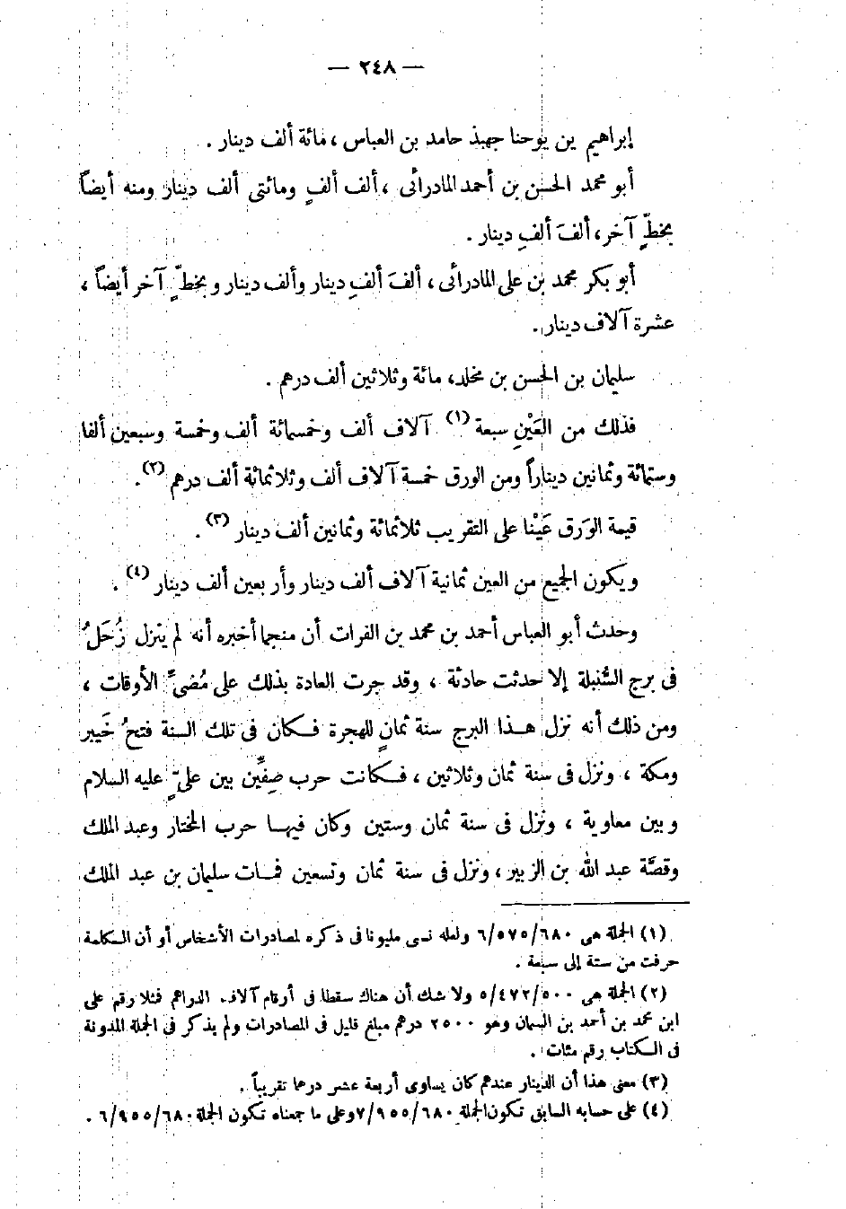 إبراهيم ين يوحنا جهبذ حامد بن العباس، مائة ألف دينار. أبو محمد الحسن بن أحمد المادرائي، ألف ألف ومائتي ألف دينار ومنه أيضاً بخط آخر، ألف ألف دينار. أبو بكر محمد بن علي المادرائي، ألف ألف دينار وألف دينار وبخط آخر أيضاً، عشرة آلاف دينار. سليمان بن الحسن بن مخلد، مائة وثلاثين ألف درهم. فذلك من العين سبعة آلاف ألف وخمسمائة ألف وخمسة وتسعين ألفاً وستمائة وثمانين ديناراً ومن الورق خمسة آلاف ألف وثلاثمائة ألف درهم. قيمة الورق عينا على التقريب ثلاثمائة وثمانين ألف دينار. ويكون الجميع من العين ثمانية آلاف ألف دينار وأربعين ألف دينار.