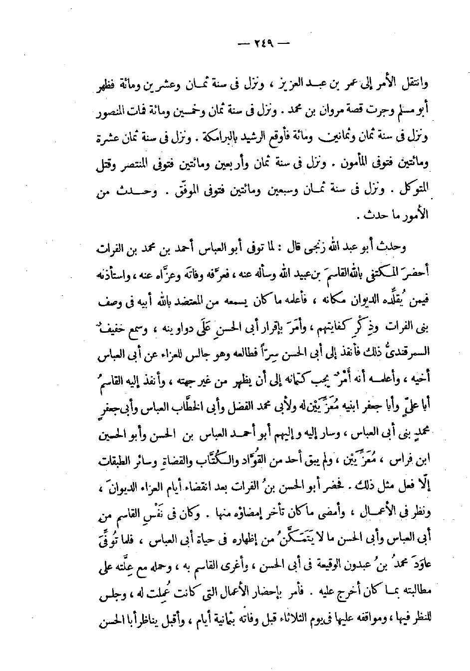 وحدث أبو عبد الله زنجي قال: لما توفي أبو العباس أحمد بن محمد بن الفرات أحضر المكتفي بالله القاسم بن عبيد الله وسأله عنه، فعرفه وفاته وعزاه عنه، واستأذنه فيمن يقلده الديوان مكانه، فأعلمه ما كان يسمعه من المعتضد بالله أبيه في وصف بني الفرات وذكر كفايتهم، وأمر بإقرار أبي الحسن على دواوينه، وسمع خفيف السمرقندي ذلك فأنفذ إلى أبي الحسن سراً فطالعه وهو جالس للعزاء عن أبي العباس أخيه، وأعلمه أنه أمر يجب كتمانه إلى أن يظهر من غير جهته، وأنفذ إليه القاسم أبا علي وأبا جعفر ابنيه معزيين له ولأبي محمد الفضل وأبي الخطاب العباس وأبي جعفر محمد بني أبي العباس، وسار إليه وإليهم أبو أحمد العباس بن الحسن وأبو الحسين ابن فراس، معزيين، ولم يبق أحد من القواد والكتاب والقضاة وسائر الطبقات إلا فعل مثل ذلك. فحضر أبو الحسن بن الفرات بعد انقضاء أيام العزاء الديوان، ونظر في الأعمال، وأمضى ما كان تأخر إمضاؤه منها. وكان في نفس القاسم من أبي العباس وأبي الحسن ما لا يتمكن من إظهاره في حياة أبي العباس، فلما توفي عاود محمد بن عبدون الوقيعة في أبي الحسن، وأغرى القاسم به، وحمله مع علته على مطالبته بما كان أخرج عليه. فأمر بإحضار الأعمال التي كانت عملت له، وجلس للنظر فيها، ومواقفه عليها في يوم الثلاثاء قبل وفاته بثمانية أيام، وأقبل يناظر أبا الحسن