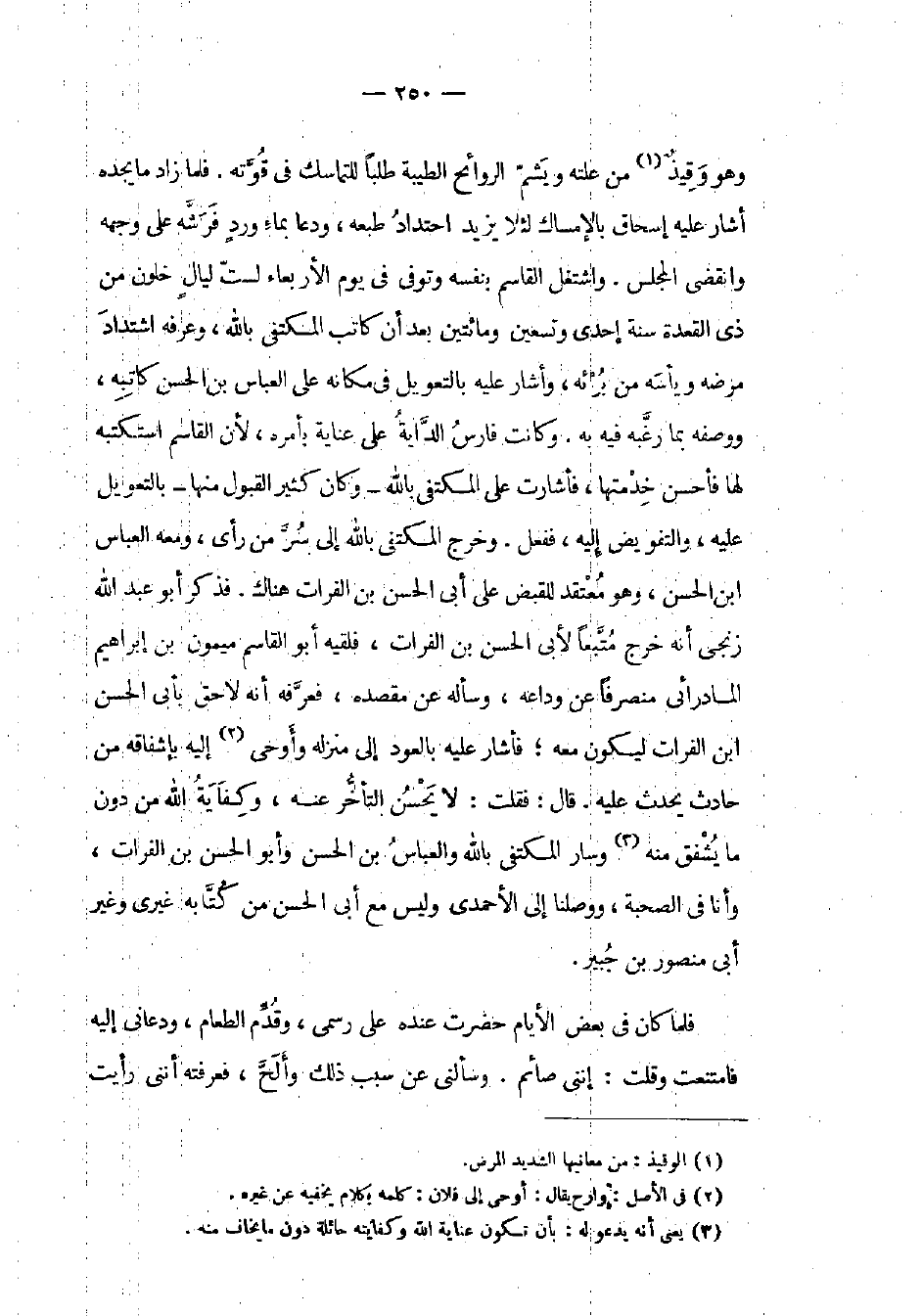 وهو وقيذ من علته ويشم الروائح الطيبة طلباً للتماسك في قوته. فلما زاد ما يجده أشار عليه إسحاق بالإمساك لئلا يزيد احتداد طبعه، ودعا بماء ورد فرشه على وجهه وانقضى المجلس. واشتغل القاسم بنفسه وتوفي في يوم الأربعاء لست ليال خلون من ذي القعدة سنة إحدى وتسعين ومائتين بعد أن كاتب المكتفي بالله، وعرفه اشتداد مرضه ويأسه من برئه، وأشار عليه بالتعويل في مكانه على العباس بن الحسن كاتبه، ووصفه بما رغبه فيه به. وكانت فارس الداية على عناية بأمره، لأن القاسم استكتبه لها فأحسن خدمتها، فأشارت على المكتفي بالله وكان كثير القبول منها بالتعويل عليه، والتفويض إليه، ففعل. وخرج المكتفي بالله إلى سر من رأي، ومعه العباس ابن الحسن، وهو معتقد للقبض علي أبي الحسن بن الفرات هناك. فذكر أبو عبد الله زنجي أنه خرج متبعاً لأبي الحسن بن الفرات، فلقيه أبو القاسم ميمون ابن إبراهيم المادرائي منصرفاً عن وداعه، وسأله عن مقصده، فعرفه أنه لاحق بأبي الحسن ابن الفرات ليكون معه: فأشار عليه بالعود إلى منزله وأوحى إليه بإشفاقه من حادث يحدث عليه. قال: فقلت: لا يحسن التأخر عنه، وكفاية الله من دون ما يشفق منه وسار المكتفي بالله والعباس بن الحسن وأبو الحسن بن الفرات، وأنا في الصحبة، ووصلنا إلى الأحمدي وليس مع أبي الحسن من كتابه غيري وغير أبي منصور بن جبير. فلما كان في بعض الأيام حضرت عنده على رسمي، وقدم الطعام، ودعاني إليه فامتنعت وقلت: إنني صائم. وسألني عن سبب ذلك وألح، فعرفته أنني رأيت