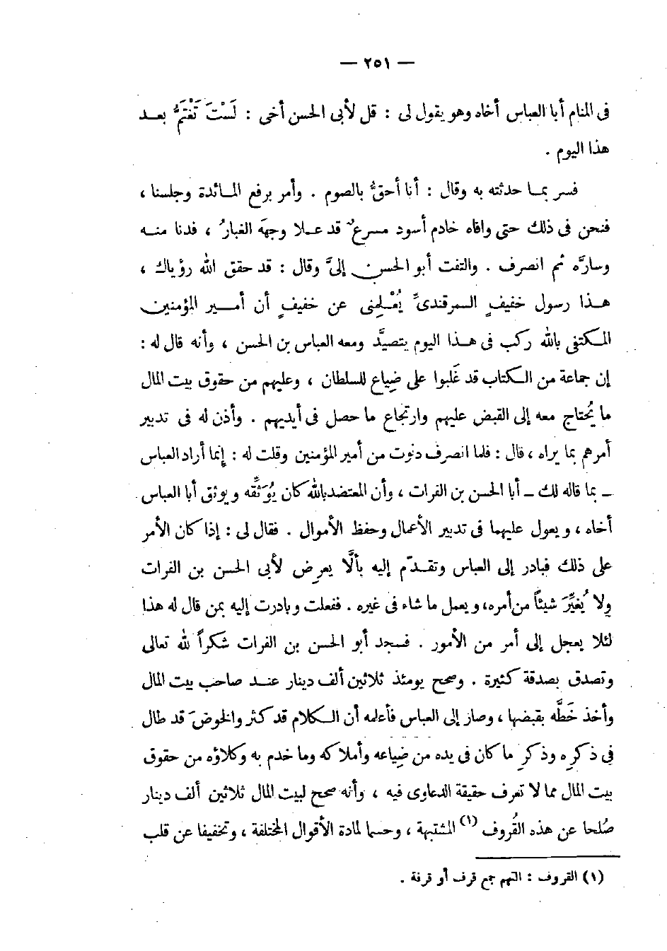 في المنام أبا العباس أخاه وهو يقوله له: قل لأبي الحسن أخي: لست تغتم بعد هذا اليوم. فسر بما حدثته به وقال: أنا أحق بالصوم. وأمر برفع المائدة وجلسنا، فنحن في ذلك حتى وافاه خادم أسود مسرع قد علا وجهه الغبار، فدنا منه وساره ثم انصرف. والتفت أبو الحسن إلي وقال: قد حقق الله رؤياك، هذا رسول خفيف السمرقندي يعلمني عن خفيف أن أمير المؤمنين المكتفي بالله ركب في هذا اليوم يتصيد ومعه العباس بن الحسن، وأنه قال له: إن جماعة من الكتاب قد غلبوا على ضياع للسلطان، وعليهم من حقوق بيت المال ما يحتاج معه إلى القبض عليهم وارتجاع ما حصل في أيديهم. وأذن له في تدبير أمرهم بما يراه، قال: فلما انصرف دنوت من أمير المؤمنين وقلت له: إنما أراد العباس بما قاله لك أبا الحسن بن الفرات، وأن المعتضد بالله كان يوثقه ويوثق أبا العباس أخاه، ويعول عليهما في تدبير الأعمال وحفظ الأموال. فقال لي: إذا كان الأمر على ذلك فبادر إلى العباس وتقدم إليه بألا يعرض لأبي الحسن بن الفرات ولا يغير شيئاً من أمره، ويعمل ما شاء في غيره. ففعلت وبادرت إليه بمن قال له هذا لئلا يعجل إلى أمر من الأمور. فسجد أبو الحسن بن الفرات شكراً لله تعالى وتصدق بصدقة كثيرة. وصحح يومئذ ثلاثين ألف دينار عند صاحب بيت المال وأخذ خطه بقبضها، وصار إلى العباس فأعلمه أن الكلام