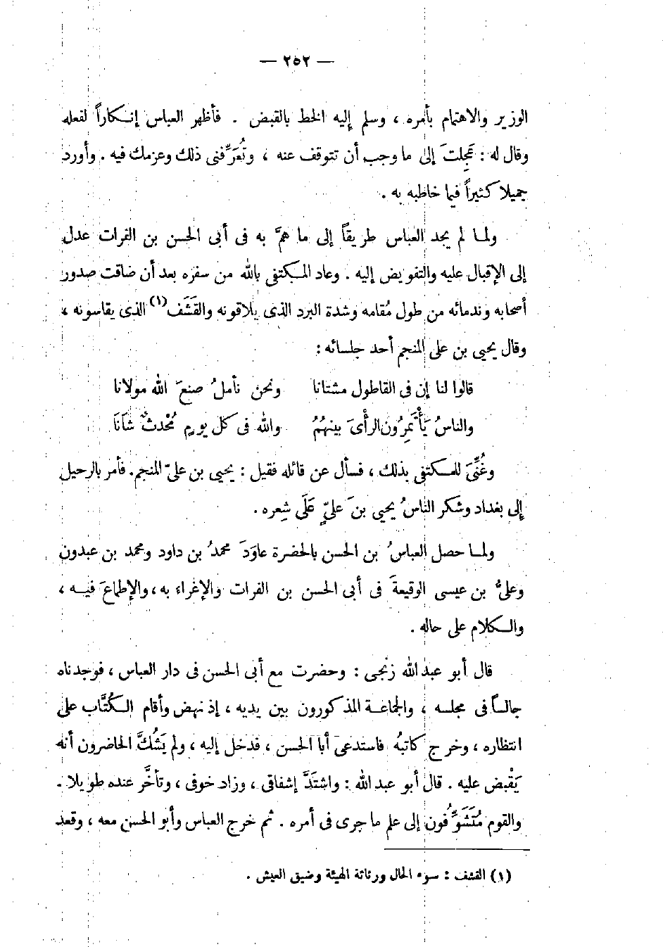 الوزير والإهتمام بأمره، وسلم إليه الخط بالقبض. فأظهر العباس إنكاراً لفعله وقال له: عجلت إلى ما وجب أن تتوقف عنه، وتعرفني ذلك وعزمك فيه. وأورد جميلاً كثيراً فيما خاطبه به. ولما لم يجد العباس طريقاً إلى ما هم به في أبي الحسن بن الفرات عدل إلى الإقبال عليه والتفويض إليه. وعاد المكتفي بالله من سفره بعد أن ضاقت صدور أصحابه وندمائه من طول مقامه وشدة البرد الذي يلاقونه والقشف الذي يقاسونه، وقال يحيي بن علي المنجم أحد جلسائه: