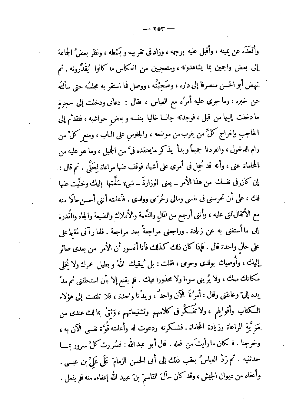 وأقعده عن يمينه، وأقبل عليه بوجهه، وزاد في تقريبه وبسطه، ونظر بعض الجماعة إلى بعض واجمين بما يشاهدونه، ومتعجبين من انعكاس ما كانوا يقدرونه. ثم نهض أبو الحسن منصرفاً إلى داره، وصحبته، ووصل فما استقر به مجلسه حتى سألته عن خبره، وما جرى عليه أمره مع العباس، فقال: دعاني ودخلت إلى حجرة ما دخلت إليها من قبل، فوجدته جالساً خالياً بنفسه وبعض حواشيع، فتقدم إلى الحاجب بإخراج كل من يقرب من موضعه، والجلوس على الباب، ومنع كل من رام الدخول، وانفردنا جميعاً وبدأ يذكر ما يعتقده في من الجميل، وما هو عليه من المحاماة عني، وأنه قد حمل في أمري على أشياء فوقف عنها مراعاة لحقي. ثم قال: إن كان في نفسك من هذا الأمر يعني الوزارة شيء سلمتها إليك وخليت عنها لك، على أن تحرسني في نفسي ومالي وحرمي وولدي. فأعلمته أنني أحسن حالاً منه مع الأثقال التي عليه، وأنني أرجع من المال والنعمة والأملاك والضيعة والجاه والقدرة إلى ما أستغني به عن زيادة. وراجعني مراجعة بعد مراجعة. فلما رآني مقيماً على على حال واحدة قال. فإذا كان ذلك كذلك فأنا أتصور أن الأمر من بعدي صائر إليك، وأوصيك بولدي وحرمي، فقلت: بل يبقيك الله ويطيل عمرك ولا يخلي مكانك منك، ولا يريني سوءاً ولا محذوراً فيك. فلم يقنع إلا بأن استحلفني ثم مد يده إلي وعانقني وقال: أمرنا الآن واحد، ويدنا واحدة، فلا تلتفت إلى هؤلاء الكتاب وأقوالهم، ولا تفكر في كلامهم وتشنيعاتهم، وثق بما لك عندي من مزية المراعاة وزيادة المحاماة. فشكرته ودعوت له وأعلمته قوة نفسي الآن به، وخرجنا. فكان ما رأيت من فعله. قال أبو عبد الله: فسررت كل سرور بما حدثنيه. ثم رد العباس بعقب ذلك إلى أبي الحسن الزمام على علي بن عيسى. وأعفاه من ديوان الجيش، وقد كان سأل القاسم ابن عبيد الله إعفاءه منه لم يفعل.
