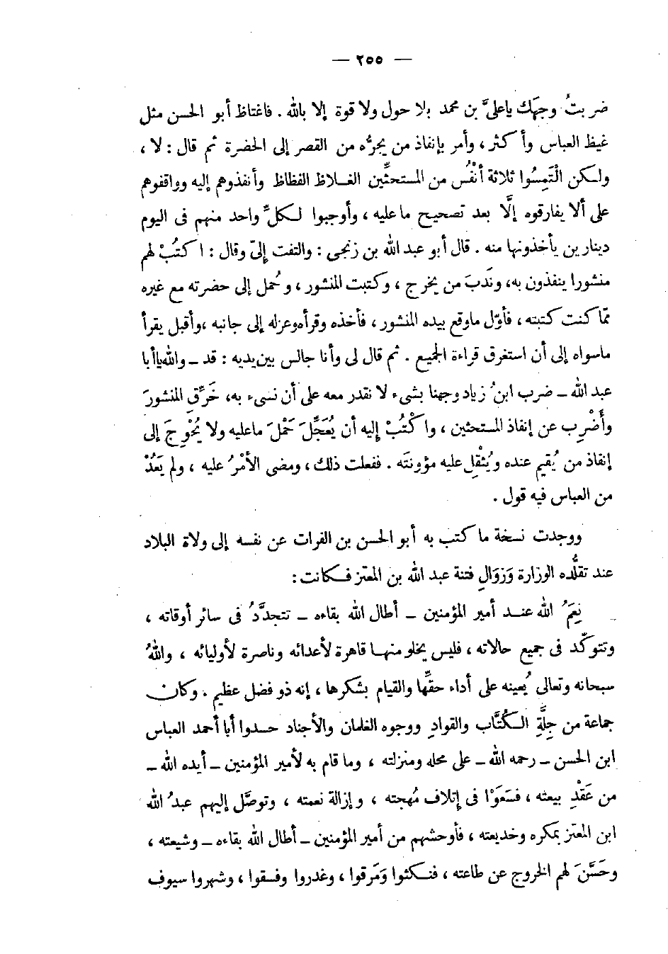 نعم الله عند أمير المؤمنين أطال الله بقاءه تتجدد في سائر أوقاته، وتتوكد في جميع حالاته، فليس يخلو منها قاهرة لأعدائه وناصرة لأوليائه، والله سبحانه وتعالى يعينه على أداء حقها والقيام بشكرها، إنه ذو فضل عظيم. وكان جماعة من جلة الكتاب والقواد ووجوه الغلمان والأجناد حسدوا أبا أحمد العباس ابن الحسن رحمة الله على محله ومنزلته، وما قام به لأمير المؤمنين أيده الله من عقد بيعته، فسعوا في إتلاف مهته، وإزالة نعمته، وتوصل إليهم عبد الله ابن المعتز بمكره وخديعته، فأوحشهم من أمير المؤمنين أطال الله بقاءه وشيعته، وحسن لهم الخروج عن طاعته، فنكثوا ومرقوا، وغدروا وفسقوا، وشهروا سيوف