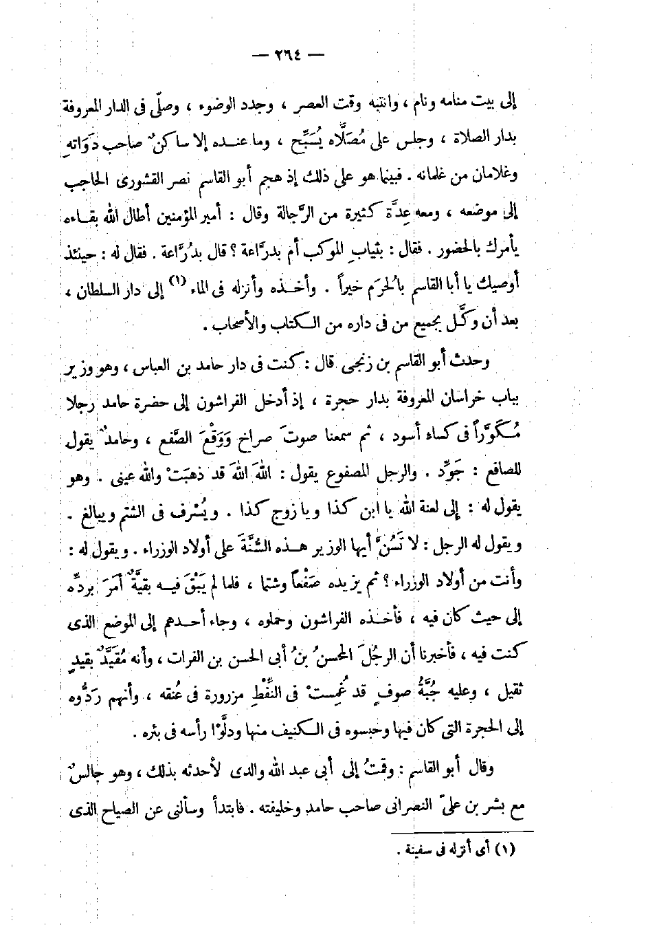 وحدث أبو القاسم بن زنجي قال: كنت في دار حامد بن العباس، وهو وزير بباب خراسان المعروفة بدار حجرة، إذ أدخل الفراشون إلى حضرة حامد رجلاً مكوراً في كساء أسود، ثم سمعنا صوت صراخ ووقع الصفع، وحامد يقول للصافع: جود. والرجل المصفوع يقول: الله الله قد ذهبت والله عيني. وهو يقول له: إلى لعنة الله يا ابن كذا ويا زوج كذا. ويسرف في الشتم ويبالغ. ويقول له الرجل: لا تسن أيها الوزير هذه السنة على أولاد الوزراء. ويقول له: وأنت من أولاد الوزراء؟ ثم يزيده صفعاً وشتماً، فلما لم يبق فيه بقية أمر برده إلى حيث كان فيه، فأخذه الفراشون وحملوه، وجاء أحدهم إلى الموضع الذي كنت فيه، فأخبرنا أن الرجل المحسن بن أبي الحسن بن الفرات، وأنه مقيد بقيد ثقيل، وعليه جبة صوف قد غمست في النفط مزرورة في عنقه، وأنهم ردوه إلى الحجرة التي كان فيها وحبسوه في الكنيف منها ودلوا رأسه في بئره.