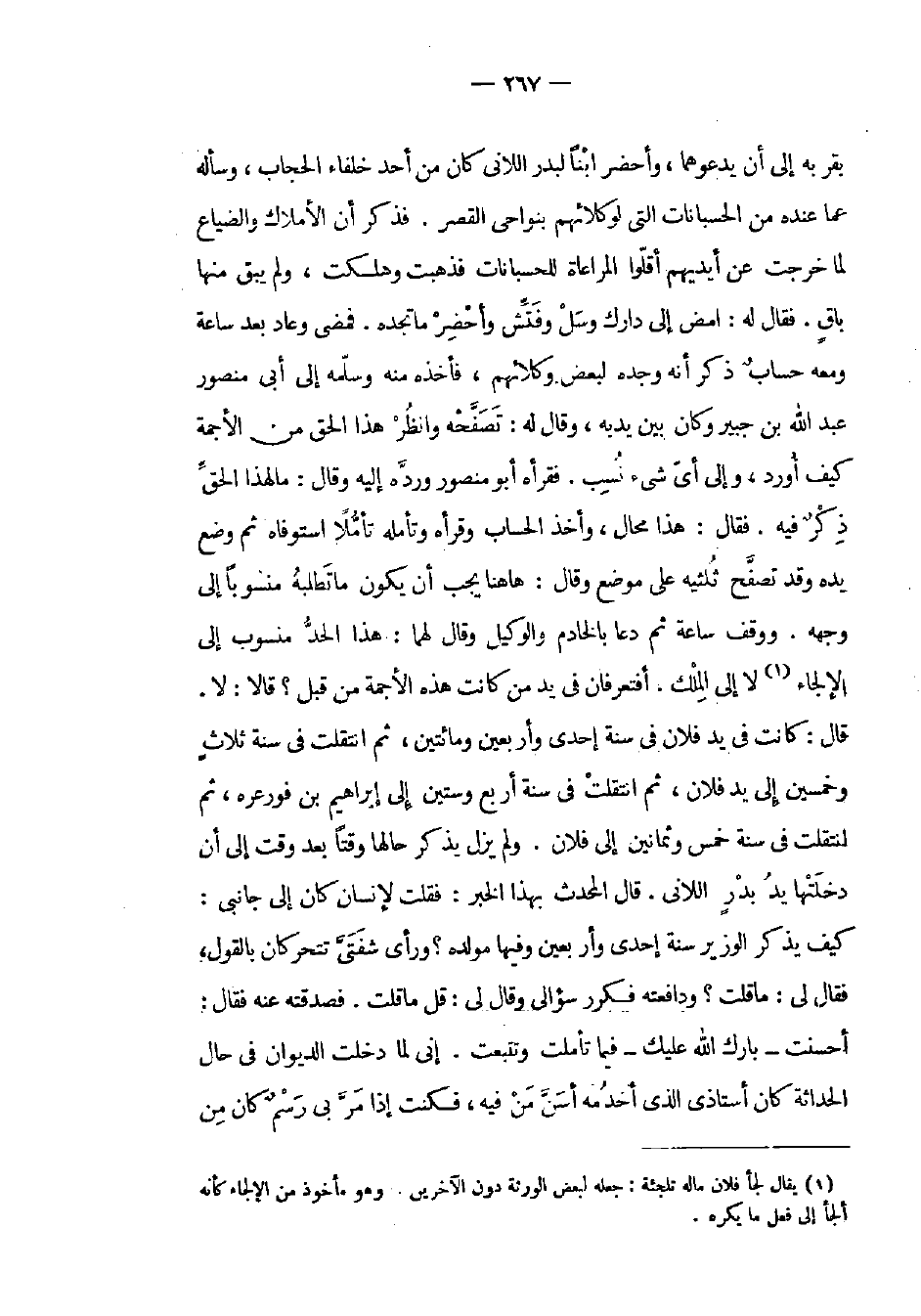 بقربه إلى أن يدعوهما، وأحضر ابناً لبدر اللاني كان من أحد خلفاء الحجاب، وسأله عما عنده من الحسبانات التي لوكلائهم بنواحي القصر. فذكر أن الأملاك والضياع لما خرجت عن أيديهم أقلوا المراعاة للحسبانات فذهبت وهلكت، ولم يبق منها باق. فقال له: امض إلى دارك وسل وفتش وأحضر ما تجده. فمضى وعاد بعد ساعة ومعه حساب ذكر أنه وجده لبعض وكلائهم، فأخذه منه وسلمه إلى أبي منصور عبد الله بن جبير وكان بين يديه، وقال له: تصفحه وانظر هذا الحق من الأجمة كيف أورد، وإلى أي شيء نسب. فقرأه أبو منصور ورده إليه وقال: ما لهذا الحق ذكر فيه. فقال: هذا محال، وأخذ الحساب وقرأه وتأمله تأملاً استوفاه ثم وضع يده وقد تصفح ثلثيه على موضع وقال: ها هنا يجب أن يكون ما تطلبه منسوباً إلى وجهه. ووقف ساعة ثم دعا بالخادم والوكيل وقال لهما: هذا الحد منسوب إلى الإلجاء لا إلى الملك. أفتعرفان في يد من كانت هذه الأجمة من قبل؟ قالا: لا. قال: كانت في يد فلان في سنة إحدى وأربعين ومائتين، ثم انتقلت في سنة ثلاث وخمسين إلى يد فلان، ثم انتقلت في سنة أربع وستين إلى إبراهيم بن فورعره، ثم انتقلت في سنة خمس وثمانين إلى فلان. ولم يزل يذكر حالها وقتاً بعد وقت إلى أن دخلتها يد بدر اللاني. قال المحدث بهذا الخبر: فقلت لإنسان كان إلى جانبي: كيف يذكر الوزير سنة إحدى وأربعين وفيها مولده؟ ورأى شفتي تتحركان بالقول، فقال لي: ما قلت؟ ودافعته فكرر سؤالي وقال لي: قل ما قلت. فصدقته عنه فقال: أحسنت بارك الله عليك فيما تأملت وتتبعت. إني لما دخلت الديوان في حال الحداثة كان أستاذي الذي أخدمه أسن من فيه، فكنت أذا مر بي رسم كان من