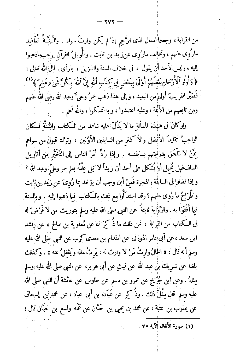 من القرابة، وجعلوا المال لذي الرحم إذا لم يكن وارث سواه. والسنة تعاضد ما روي عنهم، وتخالف ما روي عن زيد بن ثابت. وتأويل القرآن يوجب ما ذهبوا إليه، وليس لأحد أن يقول، في خلاف السنة والتنزيل، بالرأي. قال الله تعالى: " وَأُولُوا الأَرْحَامِ بَعْضُهُمْ أَوْلَى بِبَعْضٍ فِي كِتَابِ اللهِ إِنَّ الله بِكُلِّ شَيْءٍّ عَلِيمٌ " فصير القريب أولى من البعيد، وإلى هذا ذهب عمر وعلي وعبد الله رضي الله عنهم ومن تابعهم من الأئمة، وعليه اعتمدوا، وبه تمسكوا، والله أعلم. ولو كان في هذه المسألة ما لا يدل عليه شاهد من الكتاب والسنة لكان الواجب تقليد الأفضل والأكثر من السابقين الأولين، وترك قبول من سواهم ممن لا يلحق بدرجتهم بسابقته. وإذا رد أمر الناس إلى التخير من أقاويل السلف فهل يحيل أو يشكل على أحد أن زيداً لا يفي علمه بعلم عمر وعلي وعبد الله؟ وأذا فضلوا في السابقة والهجرة فمن أين وجب أن يؤخذ بما روي عن زيد بن ثابت واطراح ما روي عنهم؟ وقد استدلوا مع ذلك بالكتاب فيما ذهبوا إليه. وبالسنة فيما أفتوا به. والرواية ثابتة عن النبي صلى الله عليه وسلم بتوريث من لا فرض له في الكتاب من القرابة، فمن ذلك ما ذكر لنا عن معاوية بن صالح، عن راشد ابن سعد، عن أبي عامر الهوزني عن المقدام بن معدي كرب عن النبي صلى الله عليه وسلم أنه قال: الخال وارث من لا وارث له، يرث ماله ويعقل عنه. وكذلك بلغنا عن شريك بن عبد الله عن ليث عن أبي هريرة عن النبي صلى الله عليه وسلم مثله. وعن ابن جريج عن عمرو بن مسلم عن طاوس عن عائشة أن النبي صلى الله عليه وسلم قال مثل ذلك. وذكر عن عبادة ابن أبي عباد، عن محمد بن أسحاق عن يعقوب بن عتبة، عن محمد بن يحيى بن حبان عن عمه واسع بن حبان قال: