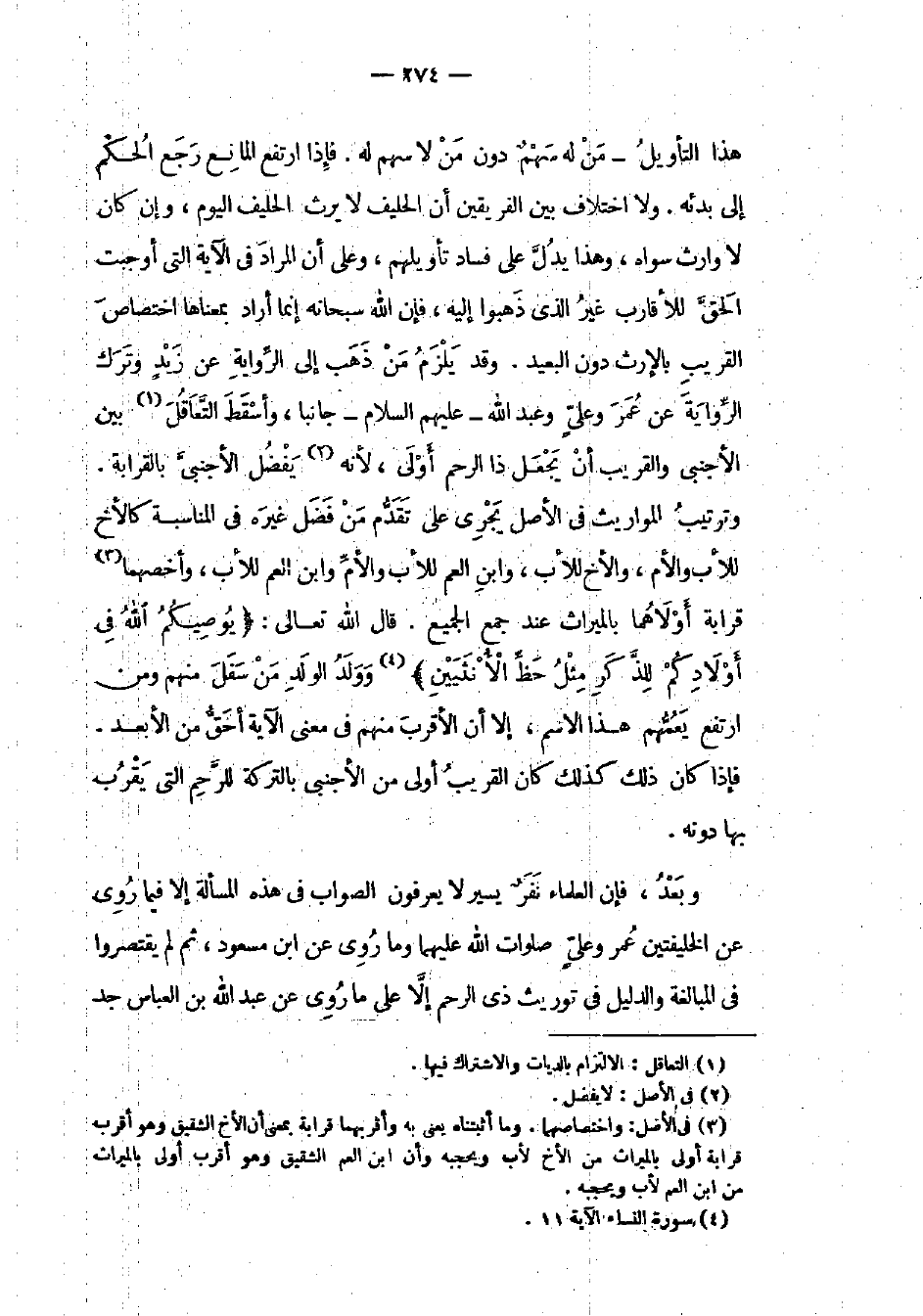 هذا التأويل من له سهم دون من لا سهم له. فإذا ارتفع المانع رجع الحكم إلى بدئه. ولا اختلاف بين الفريقين أن الحليف لا يرث الحليف اليوم، وإن كان لا وارث سواه، وهذا يدل على فساد تأويلهم، وعلى أن المراد في الآية التي أوجبت الحق للأقارب غير الذي ذهبوا إليه، فإن الله سبحانه إنما أراد بمعناها اختصاص القريب بالإرث دون البعيد. وقد يلزم من ذهب إلى الرواية عن زيد وترك الرواية عن عمر وعلي وعبد الله عليهم السلام جانباً، وأسقط التعاقل بين الأجنبي والقريب أن يجعل ذا الرحم أولى، لأنه يفضل الأجنبي بالقرابة. وترتيب المواريث في الأصل يجري على تقدم من فضل غيره في المناسبة كالأخ للأب والأم، والأخ للأب، وابن العم للأب والأم وابن العم للأب، وأخصهما قرابة أولاهما بالميراث عند جمع الجميع. قال الله تعالى: " يُوصِيكُمُ اللهُ فِي أَوْلاَدِكُمْ لِلذَّكَرِ مِثلُ حَظِّ الأُنثيين " وولد الولد من سفل منهم ومن ارتفع يعمهم هذا الاسم، إلا أن الأقرب منهم في معنى الآية أحق من الأبعد. فإذا كان ذلك كذلك كان القريب أولى من الأجنبي بالتركة للرحم التي يقرب بها دونه. وبعد، فإن العلماء نفر يسير لا يعرفون الصواب في هذه المسألة إلا فيما روي عن الخليفتين عمر وعلي صلوات الله عليهما وما روي عن ابن مسعود، ثم ل يقتصروا في المبالغة والدليل في توريث ذي الرحم إلا على ما روي عن عبد الله بن العباس جد