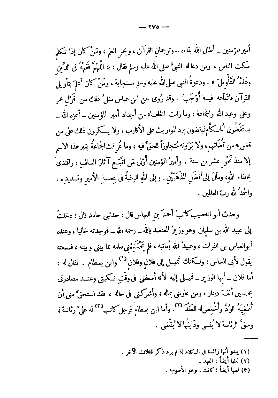 أمير المؤمنين أطال الله بقاءه وترجمان القرآن، وبحر العلم، ومن كان إذا تكلم سكت الناس، ومن دعا له النبي صلى الله عليه وسلم فقال: اللهم فقهه في الدين وعلمه التأويل. ودعوة النبي صلى الله عليه وسلم مستجابة، ومن كان أعلم بتأويل القرآن فاتباعه فيه أوجب. وقد روي عن ابن عباس مثل ذلك من قول عمر وعلي وعبد الله والجماعة، وما زالت الخلفاء من أجداد أمير المؤمنين أعزه الله يستقضون الحكام فيقضون برد المواريث على الأقارب، ولا ينكرون ذلك على من قضى به من قضاتهم، ولا يرونه متجاوزاً للحق فيه، وما عرفت الجماعة بغير هذا الاسم إلا منذ نحو عشرين سنة. وأمير المؤمنين أولى من اتبع آثار السلف، واقتدى بخلفاء الله، ومال إلى أفضل المذهبين. وإلى الله الرغبة في عصمة الأمير وتسديده. والحمد لله رب العالمين. وحدث أبو الخصيب كاتب أحمد بن العباس قال: حدثني حامد قال: دخلت إلى عبيد الله بن سليمان وهو وزير المعتضد بالله رحمه الله فوجدته خالياً، وعنده أبو العباس بن الفرات، وعبيد الله يعاتبه، فلم يحتشمني لعلمه بما بيني وبينه، فسمعته يقول لأبي العباس: ولكنك تميل إلى فلان وفلان وابن بسطام. فقال له: أما فلان أيها الوزير فميلي إليه لأنه أسعفني في وقت نكبتي وعند مصادرتي بخمسين ألف دينار، ومن عاونني بماله، وأشركني في حاله، فقد استحق مني أن أصفيه الود وأخلص العقد. وأما ابن بسطام فرجل كاتب له علي رئاسة، وحق الرئاسة لا ينسى ودينها لا يقضى.