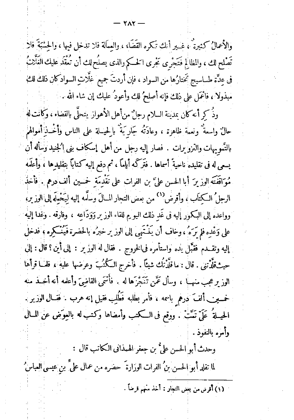 ولأاعمال كثيرة، غير أنك تكره القضاء، والعمالة فلا تدخل فيها، والحسبة فلا تصلح لك، والمظالم فتجري مجرى الحكم والذي يصلح لك أن تعقد عليك الغلات في عدة طساسيج تختارها من السواد، فإن أردت جميع غلات السواد كان ذلك لك مبذولاً، فاعمل على ذلك فأنه أصلح لك وأعود عليك أن شاء الله. وذكر أنه كان بمدينة السلام رجل من أهل الأهواز يتحلى بالقضاء، وكانت له حال واسعة ونعمة ظاهرة، وعادته جارية بالحيلة على الناس وأخذ أموالهم بالتمويهات والتزويرات. فصار إليه رجل من أهل إسكاف بني الجنيد وسأله أن يسعى له في تقليده ناحيةً أسماها. فتركه أياماً، ثم دفع إليه كتاباً بتقليدها، وأعلمه مواقفته الوزير أبا الحسن علي بن الفرات على تقدمة خمسين ألف درهم. فأخذ الرجل الكتاب، وأقرض من بعض التجار المال وسلمه إليه ليحمله إلى الوزير، وواعده إلى البكور إليه في غد ذلك اليوم للقاء الوزير ووداعه، وفارقه. وغدا إليه على وعده فلم يره، وخاف أن ينتهي إلى الوزير خبره بالحضرة فينكره، فدخل إليه وتقدم فقبل يده واستأمره في الخروج. فقال له الوزير: إلى أين؟ قال إلى حيث قلدتني. قال ما قلدتك شيئاً فأخرج الكتب وعرضها عليه فلما قرأها الوزير عجب منها، وسأل عمن تنجزها له. فأسمى القاضي وأعلمه أنه أخذ منه خمسين ألف درهم باسمه، فأمر بطلبه فطلب فقيل إنه هرب. فقال الوزير. الحيلة علي تمت. ووقع في الكتب وأمضاها وكتب له بالعوض عن المال وأمره بالنفوذ.