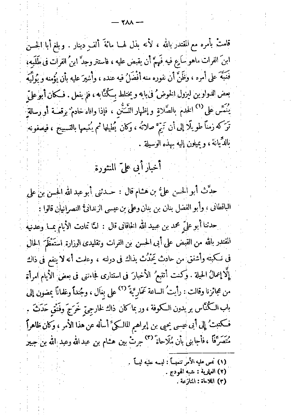 حدث أبو الحسن علي بن هشام قال: حدثني أبو عبد الله الحسن بن علي الباقطاني، وأبو الفضل بنان بن بنان وعلي بن عيسى الزنداني النصرانيان قالوا: حدثنا أبو علي محمد بن عبيد الله الخاقاني قال: لما تمادت الأيام بما وعدنيه المقتدر بالله من القبض علي أبي الحسن بن الفرات وتقليدي الوزارة استعظم الحال في نكبته وأشفق من حادث يحدث بذاك في دولته، وعلمت أنه لا ينفع في ذاك ألا إعمال الحيلة. وكنت أتتبع الأخبار في استتاري فجاءتني في بعض الأيام امرأة من عجائزنا وقالت: رأيت الساعة عماريةً على بغال، وجنداً وغلماناً يمضون إلى باب الكناس يريدون الكوفة، وربما كان ذاك لخارجي خرج وفتق حدث. فكتبت إلى أبي عيسى يحيى ابن إبراهيم المالكي أسأله عن هذا الأمر، وكان ظاهراً متبصرفاً، فأجابني بأن ملاحاة جرت بين هشام بن عبد الله وعبد الله بن جبير