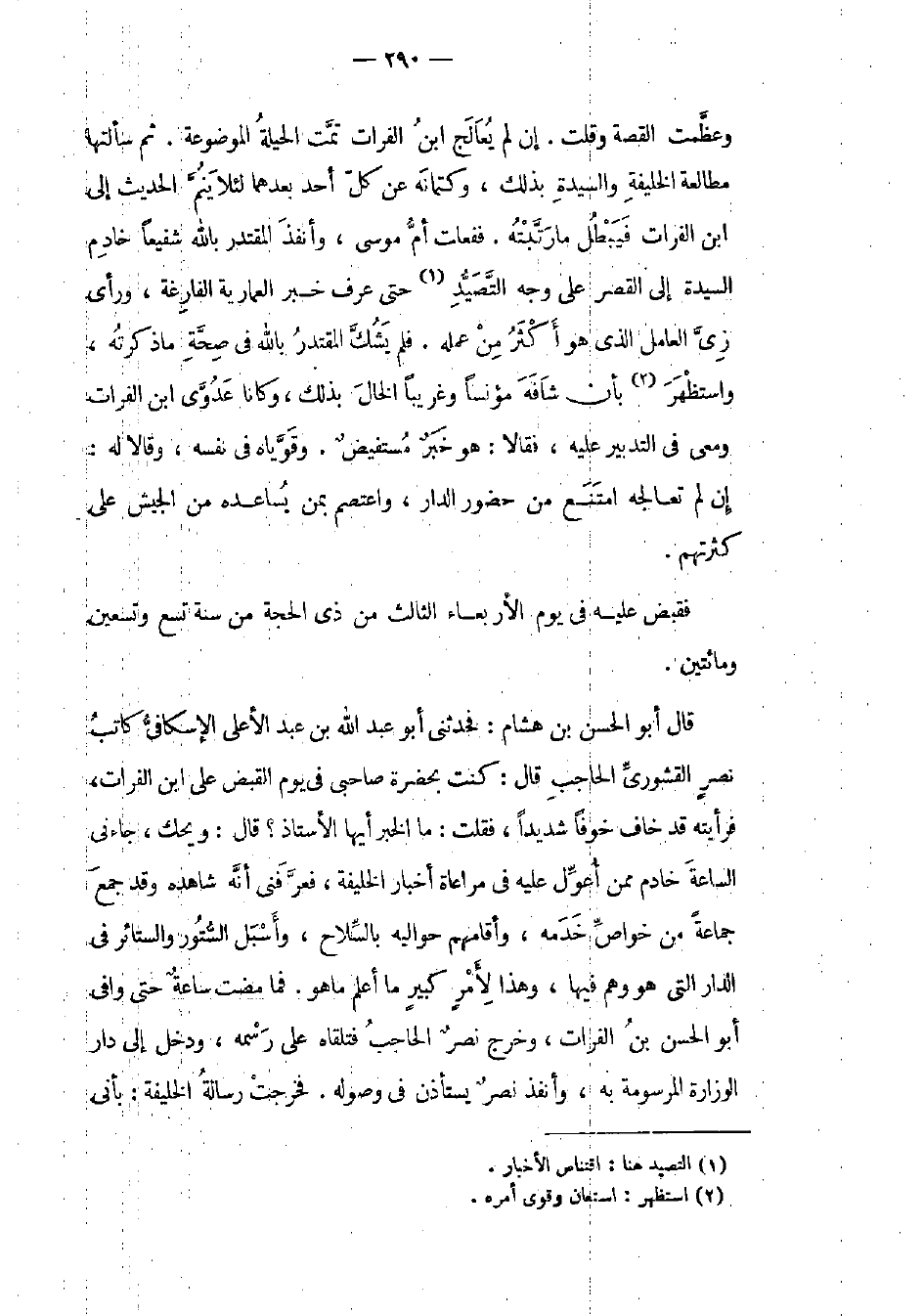 وعظمت القصة وقلت. إن لم يعالج ابن الفرات تمت الحيلة الموضوعة. ثم سألتها مطالعة الخليفة والسيدة بذلك، وكتمانه عن كل أحد بعدهما لئلا ينم الحديث إلى ابن الفرات فيبطل ما رتبه. ففعلت أم موسى، وأنفذ المقتدر بالله شفيعاً خادم السيدة إلى القصر على وجه التصيد حتى عرف خبر العمارية الفارغة، ورأى زي العامل الذي هو أكثر من عمله. فلم يشك المقتدر بالله في صحة ما ذكرته، واستظهر بأن شافه مؤنساً وغريباً الخال بذلك، وكانا عدوي ابن الفرات ومعي في التدبير عليه، فقالا: هو خبر مستفيض. وقوياه في نفسه، وقالا له: إن لم تعالجه امتنع من حضور الدار، واعتصم بمن يساعده من الجيش على كثرتهم. فقبض عليه في يوم الأربعاء الثالث من ذي الحجة من سنة تسع وتسعين ومائتين. قال أبو الحسن بن هشام: فحدثني أبو عبد الله بن عبد الأعلى الإسكافي كاتب نصر القشوري الحاجب قال: كنت بحضرة صاحبي في يوم للعرض على ابن الفرات، فرأيته قد خاف خوفاً شديداً، فقلت: ما الخبر أيها الأستاذ؟ قال: ويحك، جاءني الساعة خادم ممن أُعول عليه في مراعاة أخبار الخليفة، فعرفني أنه شاهده وقد جمع جماعةً من خواص خدمه، وأقامهم حواليه بالسلاح، وأسبل الستور والستائر في الدار التي هو وهم فيها، وهذا لأمر كبير ما أعلم ما هو. فما مضت ساعة حتى وافى أبو الحسن بن الفرات، وخرج نصر الحاجب فتلقاه على رسمه، ودخل إلى دار الوزارة المرسومة به، وأنفذ نصر يستأذن في وصوله. فخرجت رسالة الخليفة: بأني