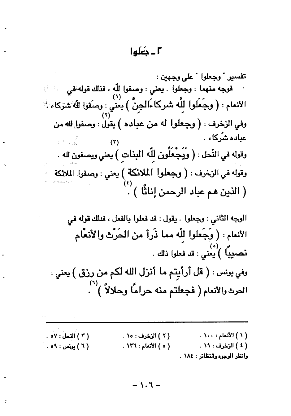 وقوله في الزخرف: وَجَعَلُوا الْمَلائِكَةَ يعني: وصفوا الملائكة الَّذِينَ هُمْ عِبادُ الرَّحْمنِ إِناثاً. (¬4)