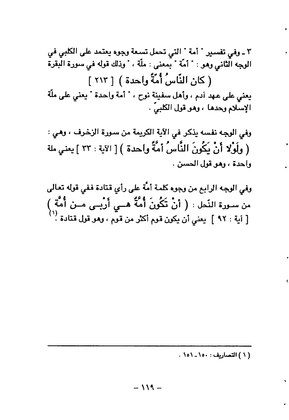 3 - وفي تفسير «أمة» التي تحمل تسعة وجوه يعتمد على الكلبي في الوجه الثاني وهو: «أمّة» بمعنى: ملّة، «وذلك قوله في سورة البقرة كانَ النَّاسُ أُمَّةً واحِدَةً [213] يعني على عهد آدم، وأهل سفينة نوح، «أمة واحدة» يعني على ملّة الإسلام وحدها، وهو قول الكلبيّ.