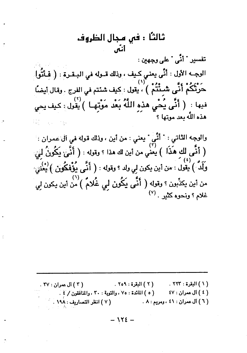 أَنَّى لَكِ هذا (¬3) يعني من أين لك هذا؟ وقوله: أَنَّى يَكُونُ لِي وَلَدٌ (¬4) يقول: من أين يكون لي ولد؟ وقوله: أَنَّى يُؤْفَكُونَ (¬5) يعني من أين يكذّبون؟ وقوله أَنَّى يَكُونُ لِي غُلامٌ (¬6) من أين يكون لي غلام؟ ونحوه كثير. (¬7)