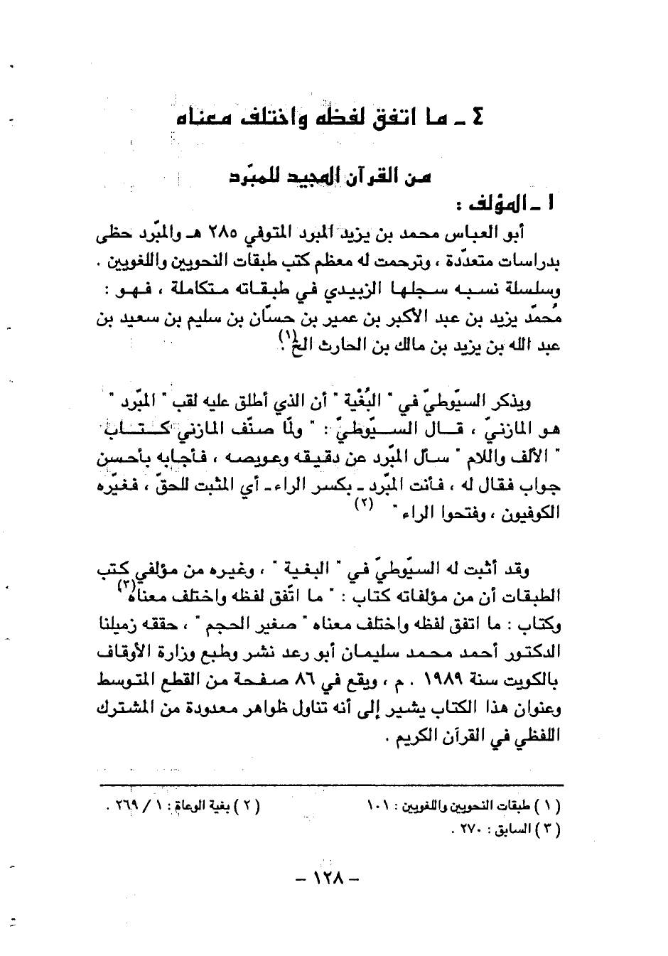 ويذكر السيّوطيّ في «البغية» أن الذي أطلق عليه لقب «المبرّد» هو المازنيّ، قال السيوطي: «ولمّا صنّف المازني كتاب «الألف واللام» سأل المبرد عن دقيقه وعويصه، فأجابه بأحسن جواب فقال له، فأنت المبرّد- بكسر الراء- أي المثبت للحقّ، فغيّره الكوفيون، وفتحوا الراء» (¬2) وقد أثبت له السيّوطيّ في «البغية»، وغيره من مؤلفي كتب الطبقات أن من مؤلفاته كتاب: «ما اتّفق لفظه واختلف معناه (¬3) وكتاب: ما اتفق لفظه واختلف معناه «صغير الحجم»، حققه زميلنا الدكتور أحمد محمد سليمان أبو رعد نشر وطبع وزارة الأوقاف بالكويت سنة 1989. م، ويقع في 86 صفحة من القطع المتوسط وعنوان هذا الكتاب يشير إلى أنه تناول ظواهر معدودة من المشترك اللفظي في القرآن الكريم.
