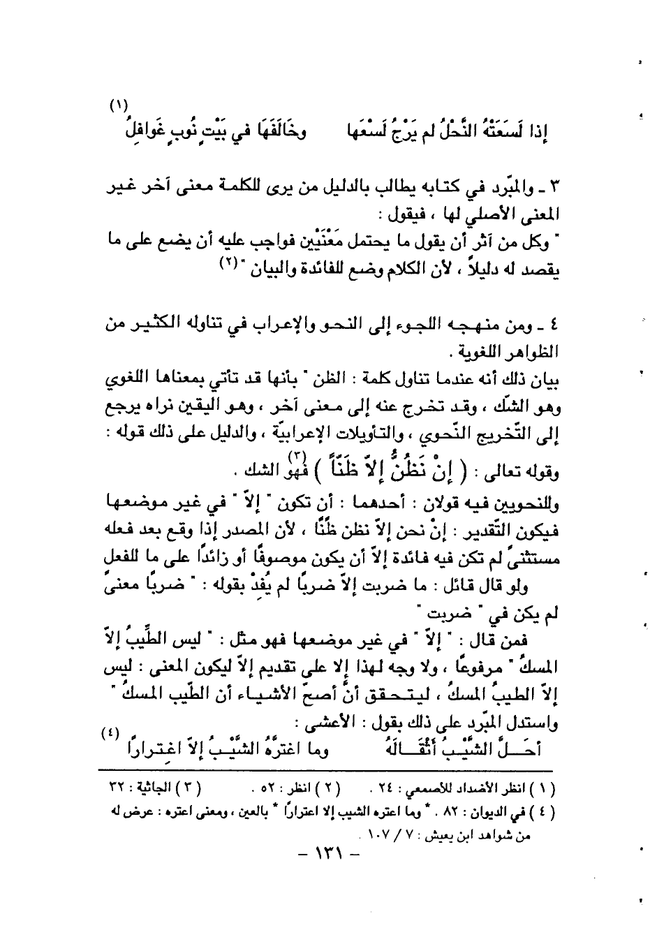 3 - والمبرّد في كتابه يطالب بالدليل من يرى للكلمة معنى آخر غير المعنى الأصلي لها، فيقول: