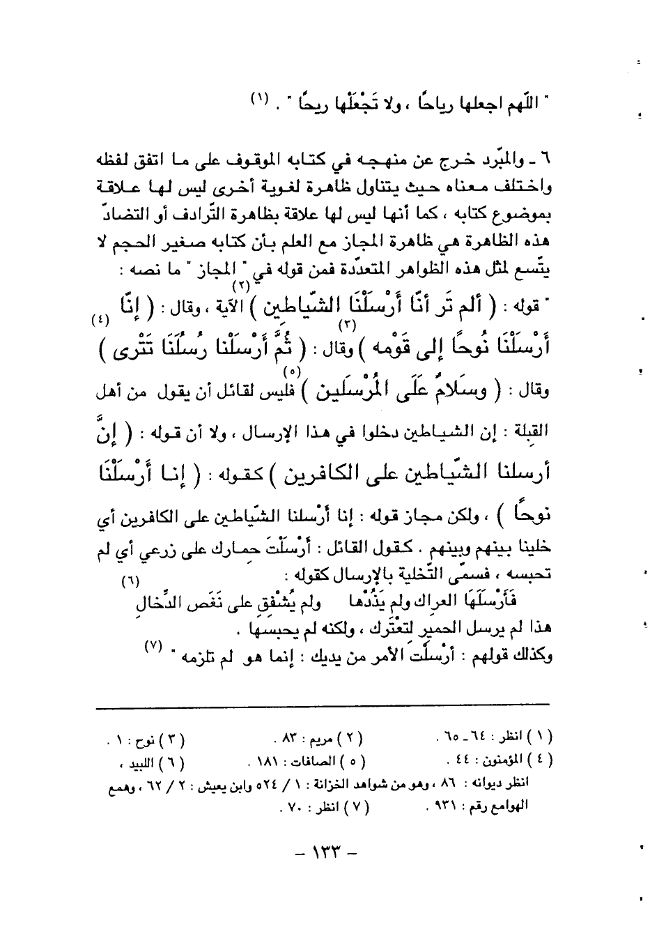 «قوله: أَلَمْ تَرَ أَنَّا أَرْسَلْنَا الشَّياطِينَ (¬2) الآية، وقال: إِنَّا أَرْسَلْنا نُوحاً إِلى قَوْمِهِ (¬3) وقال: ثُمَّ أَرْسَلْنا رُسُلَنا تَتْرا (¬4) وقال: وَسَلامٌ عَلَى الْمُرْسَلِينَ (¬5) فليس لقائل أن يقول من أهل القبلة: إن الشياطين دخلوا في هذا الإرسال، ولا أن قوله: أَنَّا أَرْسَلْنَا الشَّياطِينَ عَلَى الْكافِرِينَ كقوله: إِنَّا أَرْسَلْنا نُوحاً، ولكن مجاز قوله: إنا أرسلنا الشّياطين على الكافرين أي خلينا بينهم وبينهم. كقول القائل: أرسلت حمارك على زرعي أي لم تحبسه، فسمّى التّخلية بالإرسال كقوله: