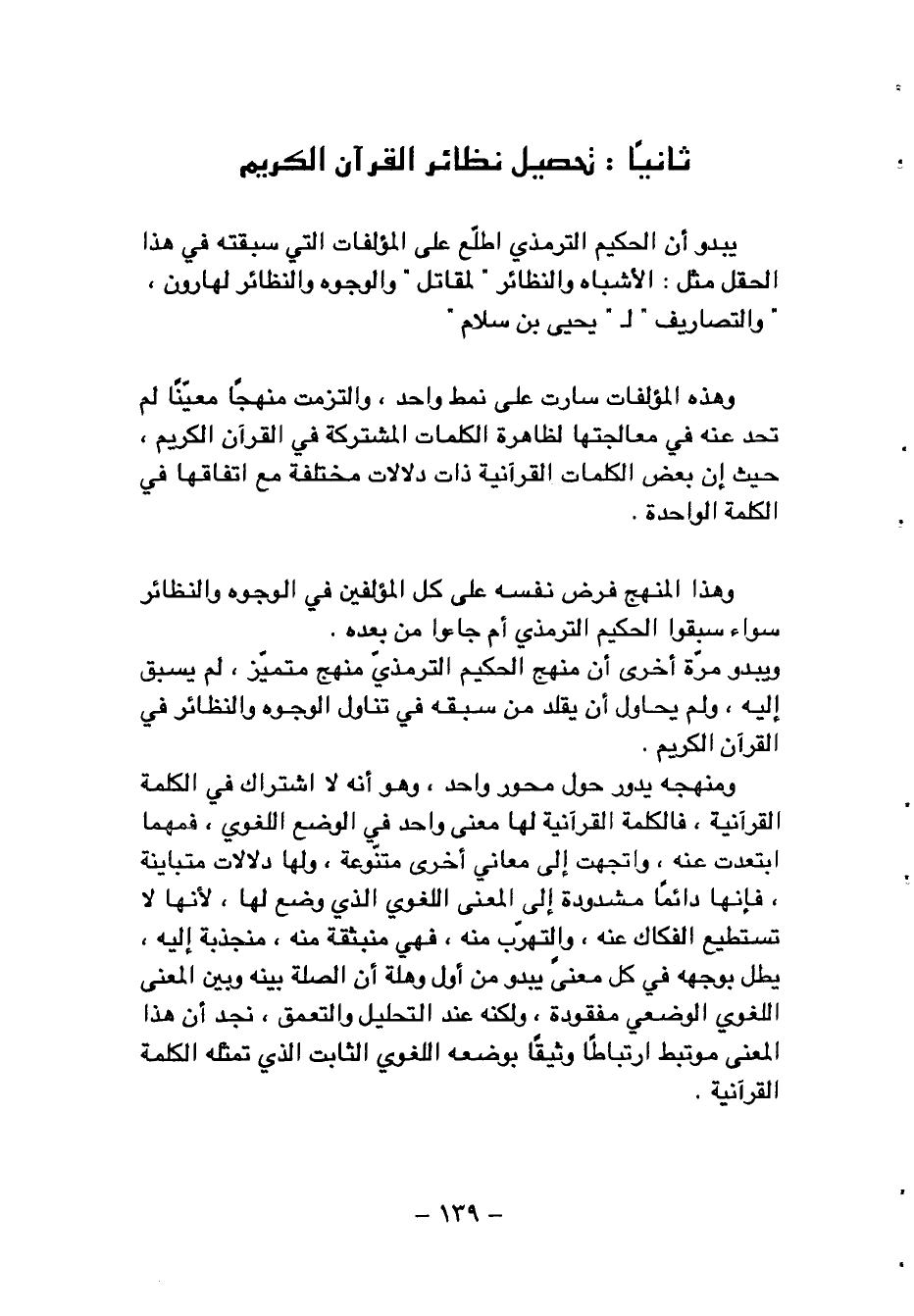 ويبدو مرّة أخرى أن منهج الحكيم الترمذيّ منهج متميّز، لم يسبق إليه، ولم يحاول أن يقلد من سبقه في تناول الوجوه والنظائر في القرآن الكريم.