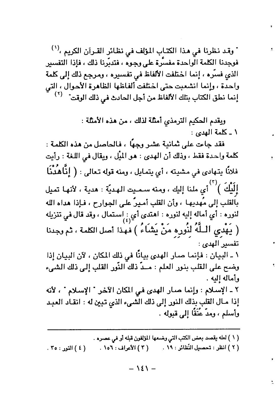 «وقد نظرنا في هذا الكتاب المؤلف في نظائر القرآن الكريم، (¬1) فوجدنا الكلمة الواحدة مفسّرة على وجوه، فتدبّرنا ذلك، فإذا التفسير الذي فسّره، إنما اختلفت الألفاظ في تفسيره، ومرجع ذلك إلى كلمة واحدة، وإنما انشعبت حتى اختلفت ألفاظها الظاهرة الأحوال، التي إنما نطق الكتاب بتلك الألفاظ من أجل الحادث في ذلك الوقت» (¬2) ويقدم الحكيم الترمذي أمثلة لذلك، من هذه الأمثلة: