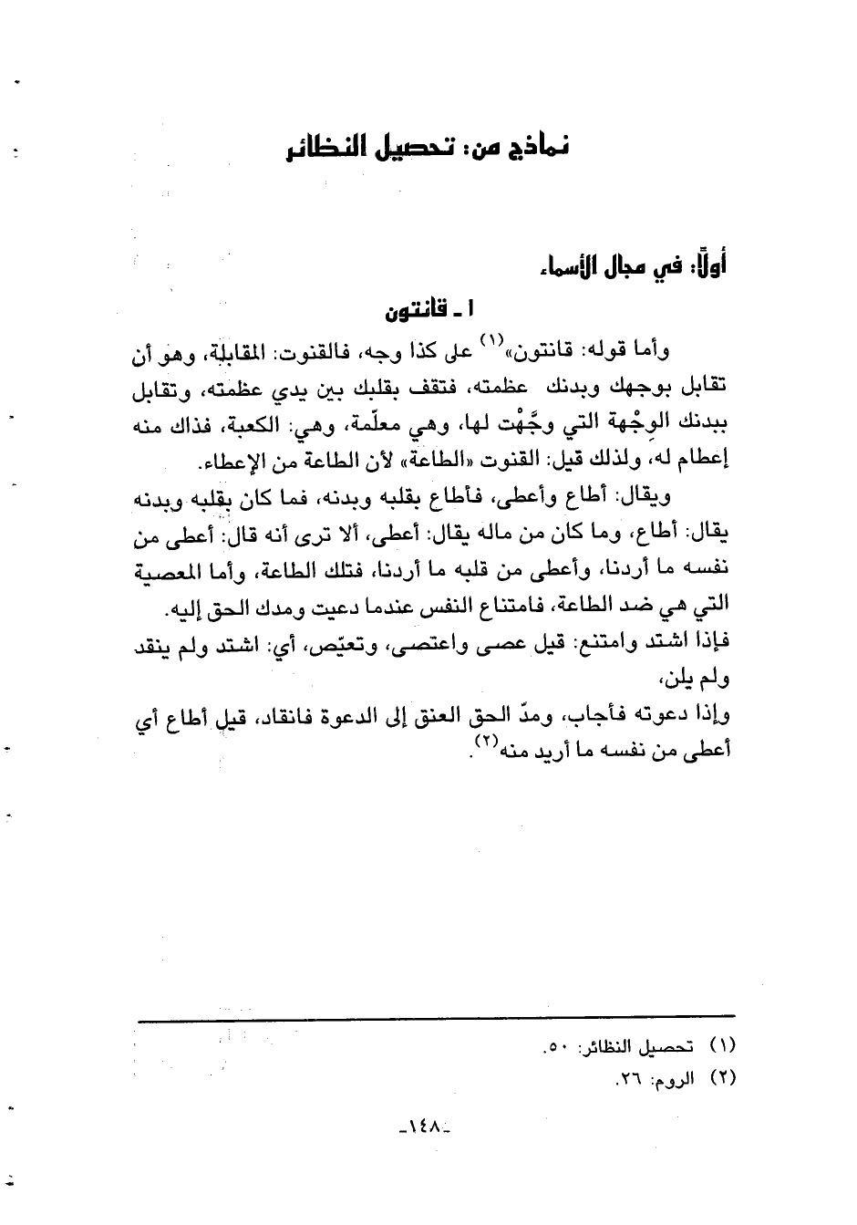 وأما قوله: «قانتون» (¬1) على كذا وجه، فالقنوت: المقابلة، وهو أن تقابل بوجهك وبدنك عظمته، فتقف بقلبك بين يدي عظمته، وتقابل ببدنك الوجهة التي وجّهت لها، وهي معلّمة، وهي: الكعبة، فذاك منه إعطام له، ولذلك قيل: القنوت «الطاعة» لأن الطاعة من الإعطاء.