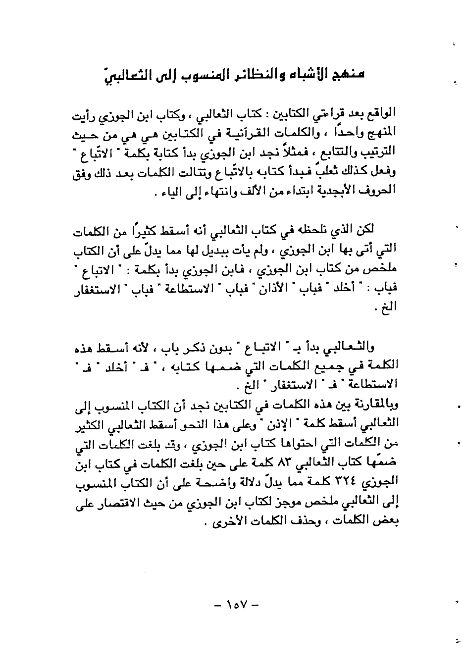 الواقع بعد قراءتي الكتابين: كتاب الثعالبي، وكتاب ابن الجوزي رأيت المنهج واحدا، والكلمات القرآنية في الكتابين هي هي من حيث الترتيب والتتابع، فمثلا نجد ابن الجوزي بدأ كتابة بكلمة «الاتّباع» وفعل كذلك ثعلب فبدأ كتابه بالاتّباع وتتالت الكلمات بعد ذلك وفق الحروف الأبجدية ابتداء من الألف وانتهاء إلى الياء.