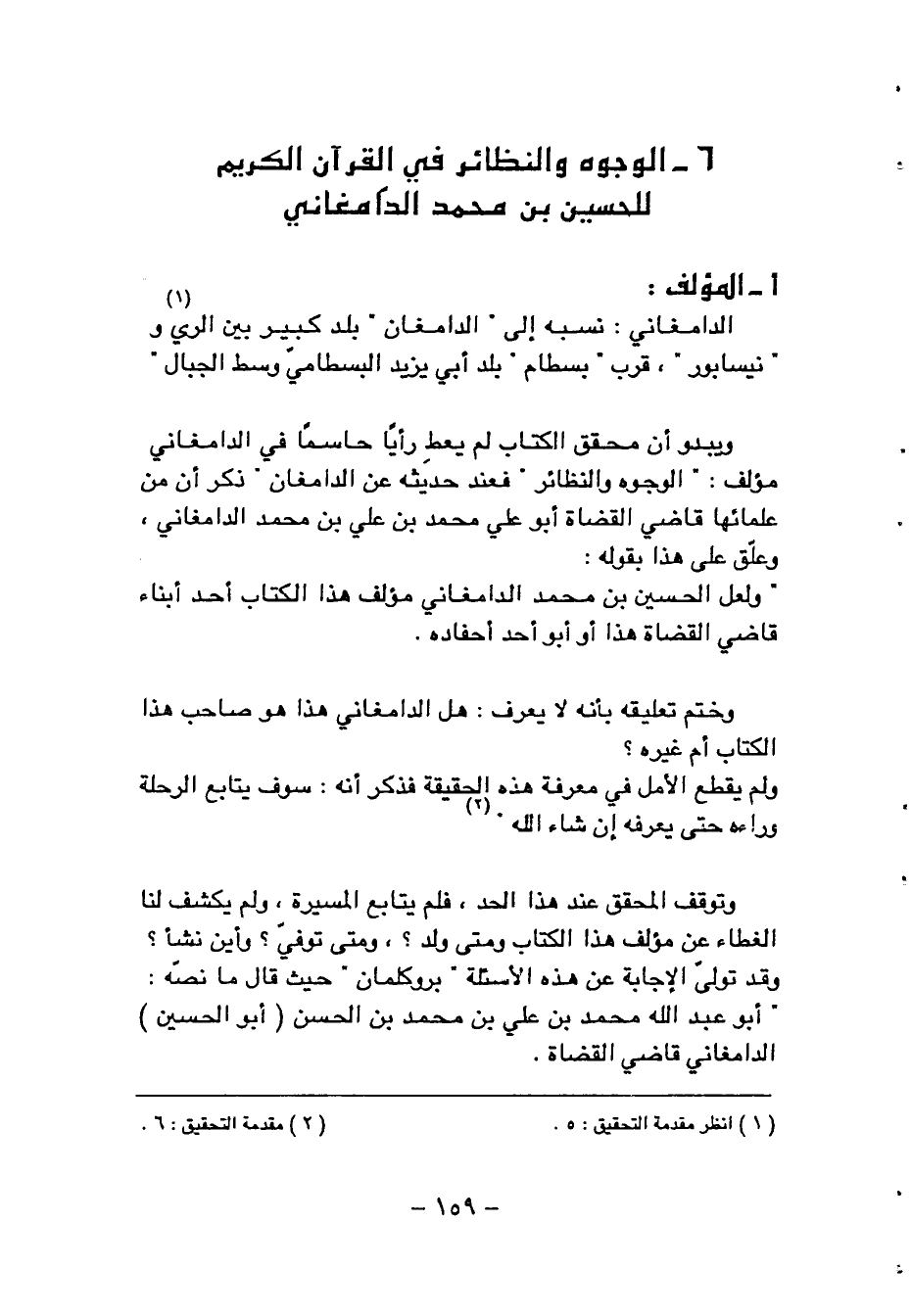 الدامغاني: نسبه إلى «الدامغان» بلد كبير بين الري (¬1) و «نيسابور»، قرب «بسطام» بلد أبي يزيد البسطاميّ وسط الجبال» ويبدو أن محقق الكتاب لم يعط رأيا حاسما في الدامغاني مؤلف: «الوجوه والنظائر» فعند حديثه عن الدامغان «ذكر أن من علمائها قاضي القضاة أبو علي محمد بن علي بن محمد الدامغاني، وعلّق على هذا بقوله: