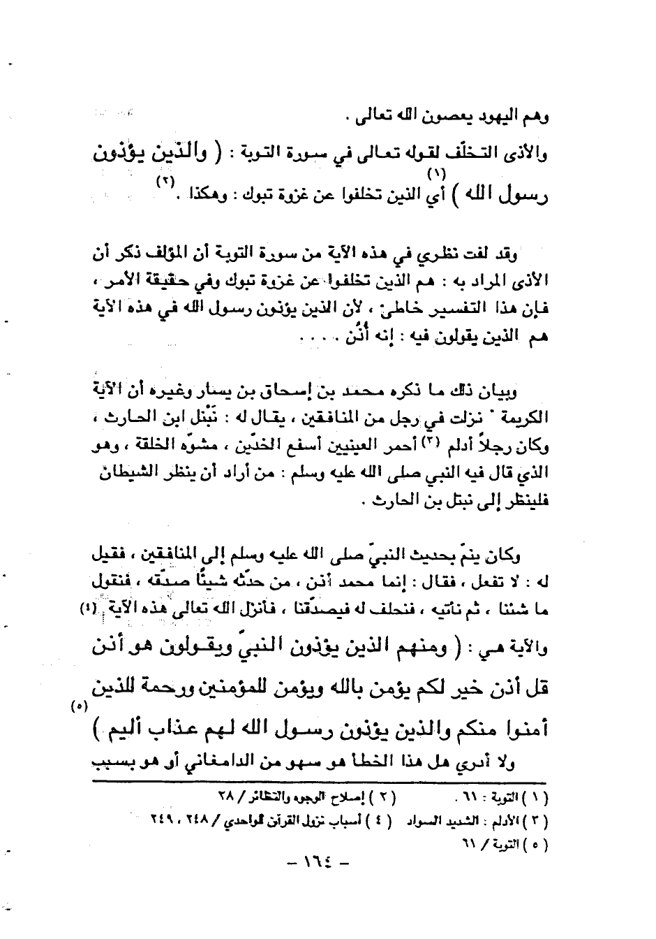 وقد لفت نظري في هذه الآية من سورة التوبة أن المؤلف ذكر أن الأذى المراد به: هم الذين تخلفوا عن غزوة تبوك وفي حقيقة الأمر، فإن هذا التفسير خاطى، لأن الذين يؤذون رسول الله في هذه الآية هم الذين يقولون فيه: إنه أنن ....