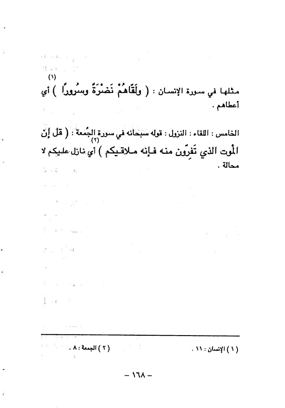 الخامس: اللقاء: النزول: قوله سبحانه في سورة الجمعة: قُلْ إِنَّ الْمَوْتَ الَّذِي تَفِرُّونَ مِنْهُ فَإِنَّهُ مُلاقِيكُمْ (¬2) أي نازل عليكم لا محالة.